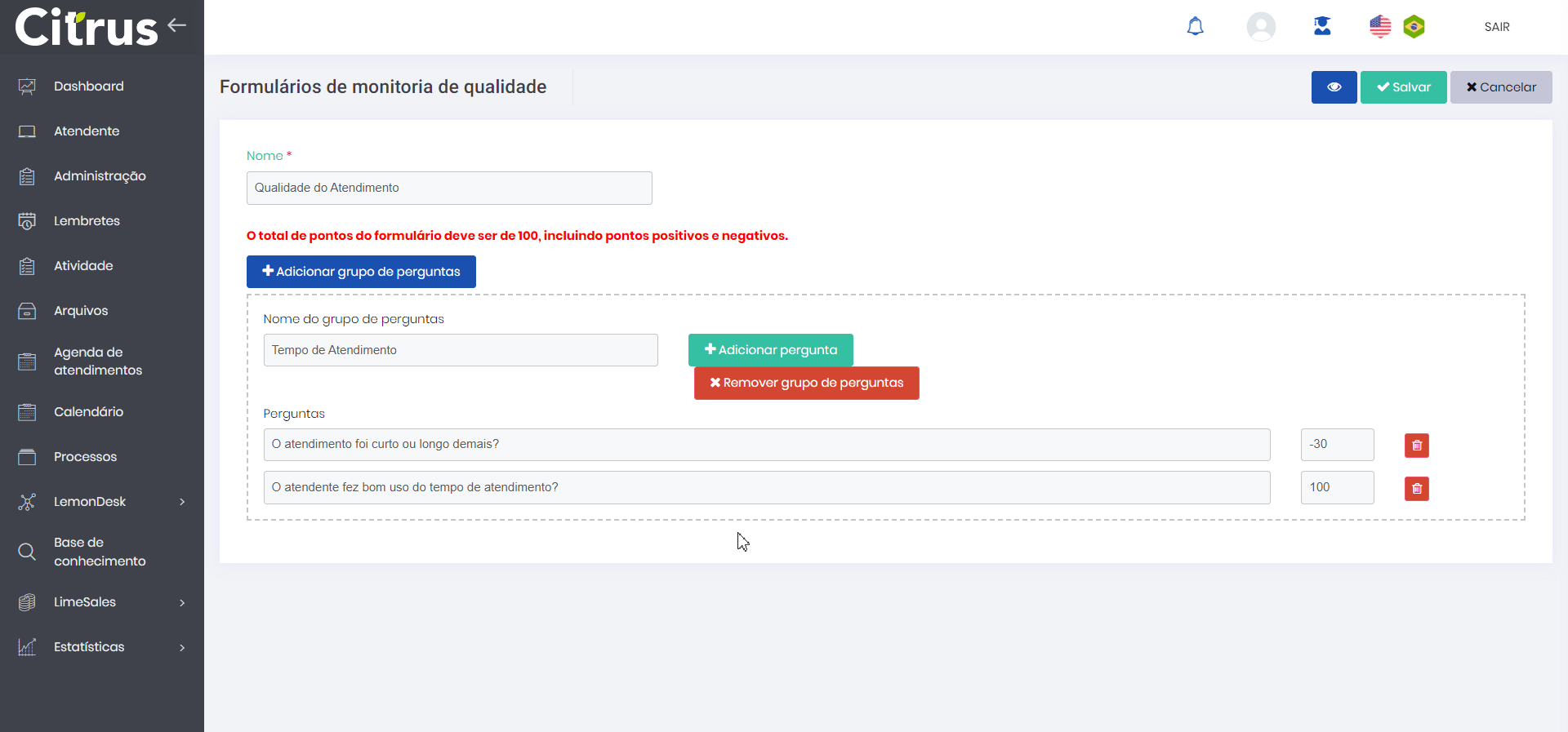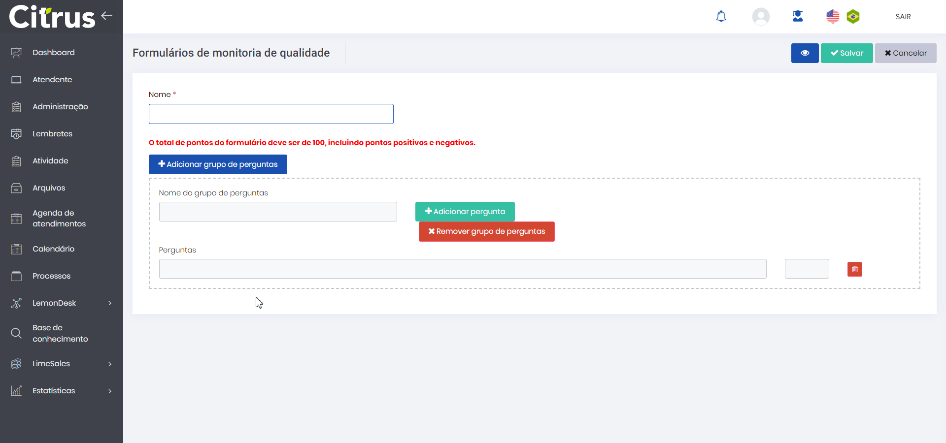 Formulários de monitoria de qualidade Estimated reading: 7 minutes 701 views O recurso de Formulários de monitoria de qualidade, voltado para Administradores e/ou Supervisores, pode ser acessado pelo menu Administração > Atendimentos > Formulários de monitoria de qualidade.A funcionalidade permite que sejam criados formulários, com grupos de perguntas de pesos associados, a serem respondidos por Supervisores. Esses formulários funcionam como ferramentas de auditoria de qualidade, contribuindo para mensurar a eficácia e adequação dos serviços prestados, bem como para avaliar, aprimorar e padronizar os processos de atendimento. Pré-requisitos Para que seja possível fazer uso da tela de Formulários de monitoria de qualidade, é necessário que os seguintes requisitos sejam atendidos:Ter perfil de usuário Supervisor ou Administrador;Ter permissões para Formulários de monitoria de qualidade habilitadas no menu Administração > Usuários > Perfil > (aba) Atendimento. Permissões Para que a funcionalidade de Formulários de monitoria de qualidade fique acessível para outros usuários da plataforma, ela precisa ser habilitada para uso por um usuário com permissão para editar Perfil. Para conceder pleno acesso à funcionalidade, o usuário Administrador deverá: 1. Acessar o menu Administração. 2. Clicar no submenu Usuários. 3. Clicar no link da tela de Perfil.*A tela de Perfil será aberta e listará todos os tipos de perfis de usuário cadastrados na plataforma. 4. Criar um perfil (clicando no botão +Novo) ou editar um perfil já existente clicando no seu Nome na lista.*A tela de cadastro de Perfil será aberta e permitirá a habilitação e desabilitação de diferentes permissões. 5. Localizar a aba “Atendimento” e habilitar as seguintes permissões:Listar formulários de monitoria de qualidadeCriar formulários de monitoria de qualidadeEditar formulários de monitoria de qualidadeExcluir formulários de monitoria de qualidade Criar Formulários de monitoria de qualidade Para criar um formulário de monitoria de qualidade, o Administrador e/ou Supervisor deverá: 1. Acessar o menu Administração > Atendimentos > Formulários de monitoria de qualidade. 2. Clicar no botão +Novo no canto superior direito para abrir a tela de cadastro. 3. Em seguida, preencher os campos:Nome: nome que identificará o formulário de monitoria de qualidade. Esse campo é obrigatório e o nome inserido não poderá ser igual ao de um formulário já cadastrado. Nome do grupo de perguntas: nome que designa um agrupamento de perguntas correlacionadas (ex.: Avaliação comportamental).O usuário poderá adicionar um ou mais grupos de perguntas ao formulário por meio do botão +Adicionar grupo de perguntas. Para removê-los, basta clicar em Remover grupo de perguntas no quadro do grupo correspondente.Perguntas: questionamentos a respeito da qualidade do atendimento (ex.: O atendente foi cordial?). No campo ao lado da pergunta, deverá ser atribuído um peso a ela, digitado-se um valor inteiro de -100 a 100.É possível adicionar mais perguntas pressionando o botão +Adicionar pergunta e excluir uma pergunta clicando no ícone de lixeira ()ao lado dos seus campos. 4. Clicar em Salvar para concluir o cadastro ou, em Cancelar, caso desista da ação. *Se a soma dos pesos das perguntas não for igual a 100, será exibida uma mensagem de alerta, informando que os valores não correspondem ao padrão exigido, devendo ser ajustados antes de salvar o formulário. DICAS:Antes de concluir o cadastro, clicando no botão Salvar, é possível pré-visualizar o formulário por meio do botão ao lado (). Por padrão, todos os formulários serão criados com status de Inativo para evitar que outros usuários tenham acesso a eles enquanto ainda estão sendo desenvolvidos. Localizar Formulários de monitoria de qualidade Siga as instruções a seguir para encontrar um cadastro na listagem de Formulários de monitoria de qualidade. 1. Acesse o menu Administração. 2. Clique no submenu Atendimentos. 3. Clique no link da tela de Formulários de monitoria de qualidade.*A tela de Formulários de monitoria de qualidade será aberta e listará todos os formulários já cadastrados. 4. Clique no botão Filtro no topo direito da tela. 5. Preencha o campo “Nome” com o nome do formulário que deseja encontrar e clique em Pesquisar.*Os resultados serão listados na tela logo em seguida. Clonar Formulários de monitoria de qualidade É possível, também, criar cópias de formulários de monitoria de qualidade. Para isso, o Administrador e/ou Supervisor deverá: 1. Acessar a tela de Formulários de monitoria de qualidade (menu Administração > Atendimentos > Formulários de monitoria de qualidade). 2. Clicar no nome do formulário que deseja duplicar para abrir sua tela de configuração. 3. Pressionar o botão Clonar na parte superior direita da tela. *O novo formulário duplicado terá o mesmo nome do anterior acrescido de “[copia]” e, por padrão, seu status ficará Inativo. DICA: Conforme a regra geral, o formulário clonado não poderá ser salvo com o mesmo nome de um formulário já cadastrado. Editar Formulários de monitoria de qualidade Após configurar, salvar e fechar um cadastro de formulário de monitoria de qualidade, ao precisar editar informações contidas nele, será necessário abrir o formulário pela tela de Formulários de monitoria de qualidade, seguindo os passos a seguir: 1. Acesse o menu Administração. 2. Clique no submenu Atendimentos. 3. Clique no link da tela de Formulários de monitoria de qualidade.*A tela de Formulários de monitoria de qualidade será aberta e listará todos os formulários já cadastrados. 4. Localize o formulário que deseja Editar. 5. Clique no Nome do formulário para abrir a tela de edição. 6. Faça os ajustes desejados e pressione Salvar no topo direito da tela. Caso desista da ação, clique em Cancelar. IMPORTANTE: Quando o Administrador e/ou Sup