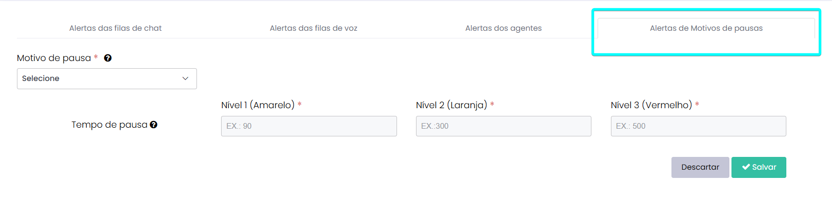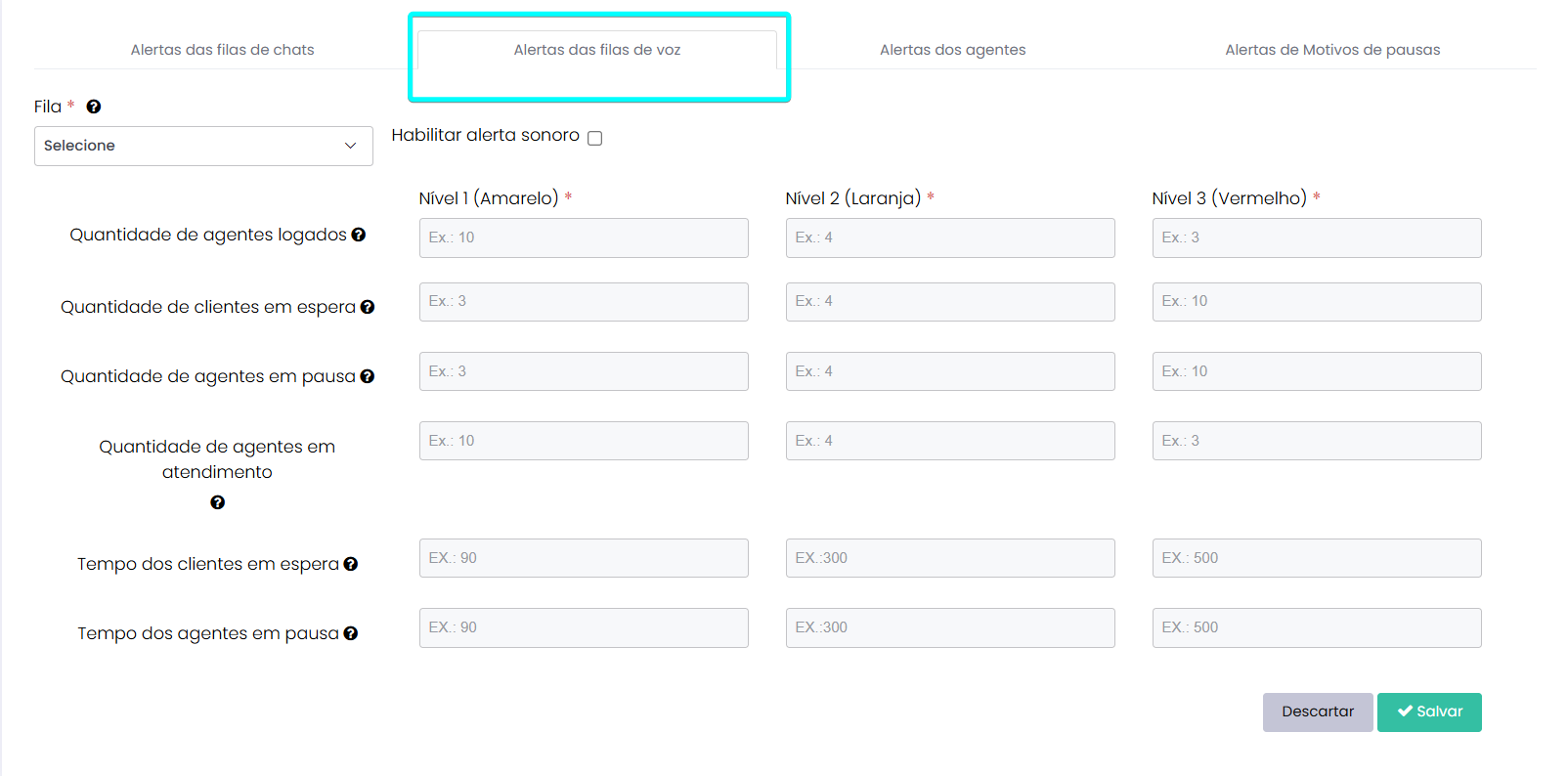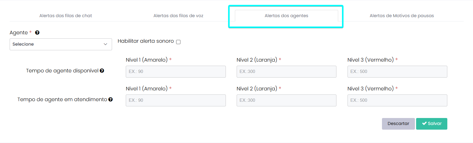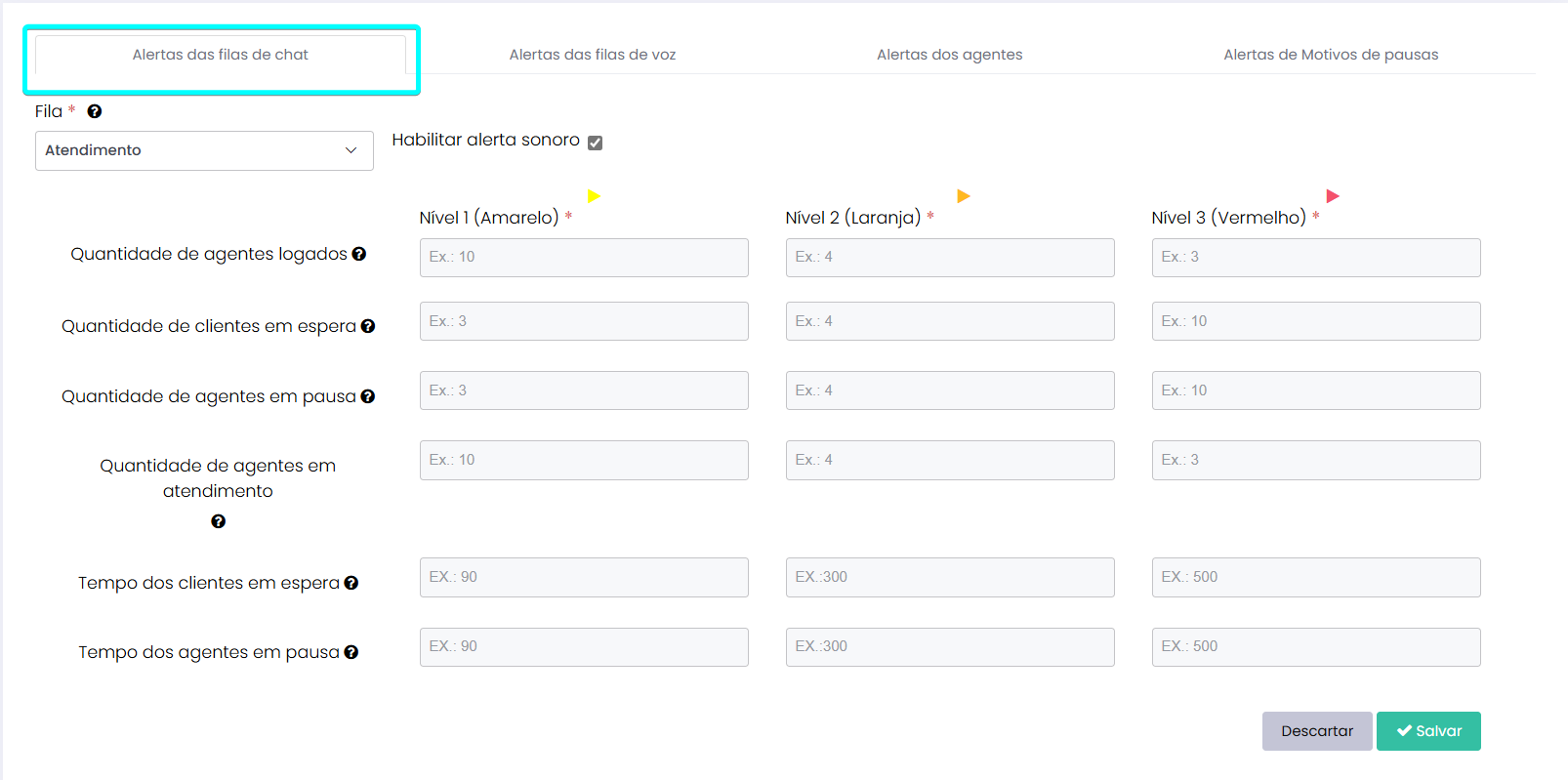 Alertas de Monitoramento Estimated reading: 4 minutes 548 views 01/04/2025 Os Alertas de monitoramento permitem que a supervisão seja avisada pela tela de Monitoramento (Estatísticas > Monitoramento) sobre situações de criticidade envolvendo os atendimentos.O recurso funciona através de notificações visuais e sonora, que podem ser configuradas em Administração > Atendimentos > Alertas de monitoramento:Cor amarela: Baixa criticidade.Cor laranja: Média criticidade.Cor vermelha: Alta criticidade.Alerta sonoro: Podem ser emitidos sons diferentes para cada grau de criticidade. As configurações ajudam o Supervisor a identificar rapidamente cenários que merecem maior atenção durante a atividade de monitoramento. Permissões e Pré-requisitos Para utilizar o recurso é necessário:Ter perfil de usuário Supervisor.Possuir permissão habilitada para Alertas de monitoramento, concedida por usuário com permissão para editar Perfil, pelo menu Administração > Usuários > Usuário > Perfil > (aba) Atendimento. Criar Alertas de monitoramento A tela de Alertas de monitoramento lista os alertas já configurados, com informações organizadas nas colunas “Supervisor” e “Grupo de monitoramento”.Os alertas podem ser gerados para filas de chat (WebChat e WhatsApp), filas de voz, Agentes (Atendentes) e Motivos de pausas.No topo direito é apresentado o botão +Novo. Para criar um novo alerta proceda como a seguir: Pressione o botão +Novo para abrir a tela de configuração. O campo obrigatório “Supervisor” será preenchido automaticamente com o nome do usuário Supervisor logado. Selecione o Grupo de monitoramento para o qual o alerta será criado e clique em Salvar e continuar. Uma nova tela será aberta com abas para configuração dos Alertas de monitoramento. Filas de chat e Filas de voz: Acesse as abas Alertas das filas de chats e/ou Alertas das filas de voz. No campo “Fila” selecione a fila para a qual os alertas configurados serão aplicados. É possível configurar alertas para diferentes filas. Uma por vez. Marque a flag “Habilitar alerta sonoro” caso deseje ativar a emissão de sons que indicarão o nível de criticidade. *Quando essa opção estiver habilitada, serão exibidos ícones de reprodução nas cores correspondentes aos níveis de criticidade (amarelo, laranja e vermelho). Ao clicá-los, o Supervisor poderá ouvir os sons que serão emitidos em cada um dos cenários. Preencha os campos das colunas “Nível 1 (Amarelo)”, “Nível 2 (Laranja)” e “Nível 3 (Vermelho)”: • Quantidade de agentes (Atendentes) logados: Informe a quantidade de agentes logados na fila de chat ou de voz para cada nível de criticidade. Considere que quanto menor a quantidade de Atendentes logados, maior o nível de criticidade. • Quantidade de clientes em espera: Informe a quantidade de clientes em espera na fila para cada nível de criticidade (quanto maior a quantidade de clientes em espera, maior o nível de criticidade). • Quantidade de agentes em pausa: Informe a quantidade de agentes (Atendentes) em pausa para cada nível de criticidade (quanto maior a quantidade de agentes em pausa, maior o nível de criticidade). • Quantidade de agentes em atendimento: Informe a quantidade de agentes (Atendentes) em atendimento para cada nível de criticidade (quanto maior a quantidade de agentes em atendimento, menor o nível de criticidade). • Tempo dos clientes em espera: Informe o tempo de espera na fila para cada nível de criticidade (em segundos), considere que: quanto maior o tempo de espera dos clientes, maior o nível de criticidade. • Tempo dos agentes em pausa: Informe o tempo de pausa dos agentes (Atendentes) para cada nível de criticidade (em segundos), considere que quanto maior o tempo de pausa dos agentes, maior o nível de criticidade. Alertas das filas de chat. Alertas das filas de voz. Alertas dos agentes: É possível criar alertas para o tempo de sessão dos agentes (Atendentes), para identificar se os atendimentos realizados estão levando mais tempo que o considerado aceitável. Além disso, podem ser gerados alertas referentes ao tempo de disponibilidade dos agentes para evitar ociosidade. *O tempo de disponibilidade do agente (Atendentes) corresponde ao tempo em que se encontra logado em fila(s) de qualquer canal, disponível para receber cards, mas sem realizar atendimento. Acesse a aba Alertas dos agentes. • No campo “Agente” selecione o Atendente para o qual os níveis de criticidade configurados serão aplicados. *O Supervisor poderá configurar alertas para diferentes Atendentes, um por vez. • Marque a flag “Habilitar alerta sonoro” caso deseje ativar a emissão de sons que indicarão o nível de criticidade. *Quando essa opção estiver habilitada, serão exibidos ícones de reprodução nas cores correspondentes aos níveis. Ao clicá-los, o Supervisor poderá ouvir os sons que serão emitidos em cada um dos cenários. • Preencha os campos das colunas “Nível 1 (Amarelo)”, “Nível 2 (Laranja)” e “Nível 3 (Vermelho)”: - Tempo de agente disponível: Informe o tempo de disponibilidade do Atendente (em segundos) para cada nível de criticidade (quanto maior o tempo de disponibilidade, menor o nível de criticidade). - Tempo de agente em atendimento: Informe o tempo em que o Atendente se encontra realizando um atendimento (em segundos) para cada nível de criticidade. Considere que quanto maior o tempo em atendimento, maior o nível de criticidade. 📌 Os alertas de tempo de disponibilidade e de tempo em atendimento configurados para um Atendente serão aplicados independentemente dos canais de atendimento em que ele estiver logado. Alertas dos agentes. Alertas de Motivos de pausas: Permite configurar alertas que serão associados ao tempo de pausa dos Atendentes, de acordo com os motivos de pausa selecionados por eles. Assim, é possível verirficar se o tempo de indisponibilidade do Atendentes corresponde