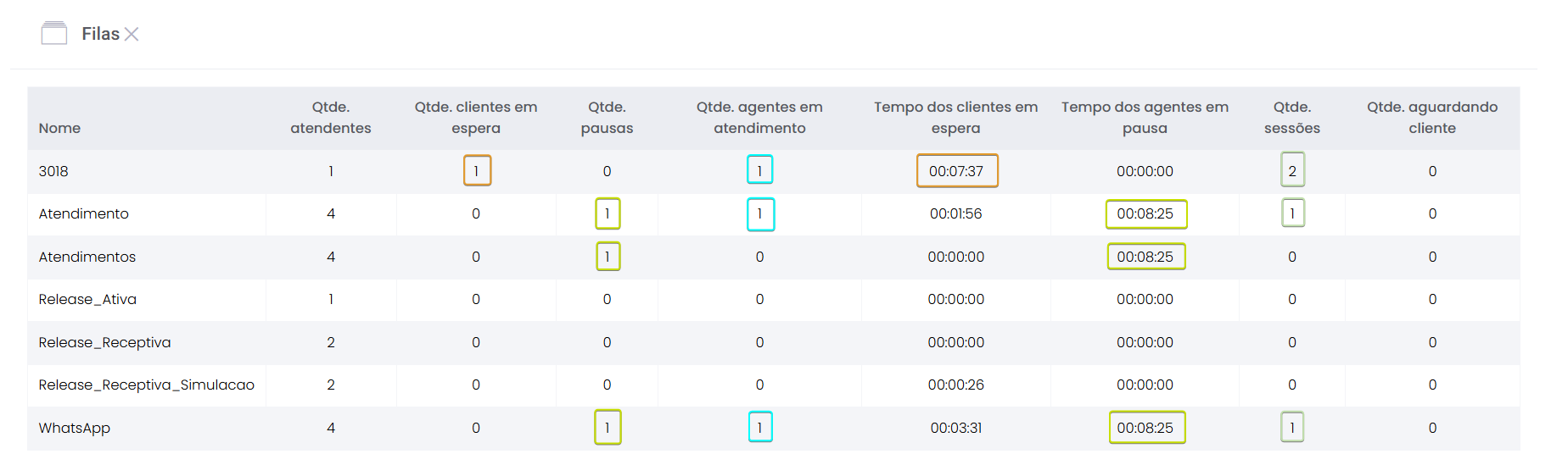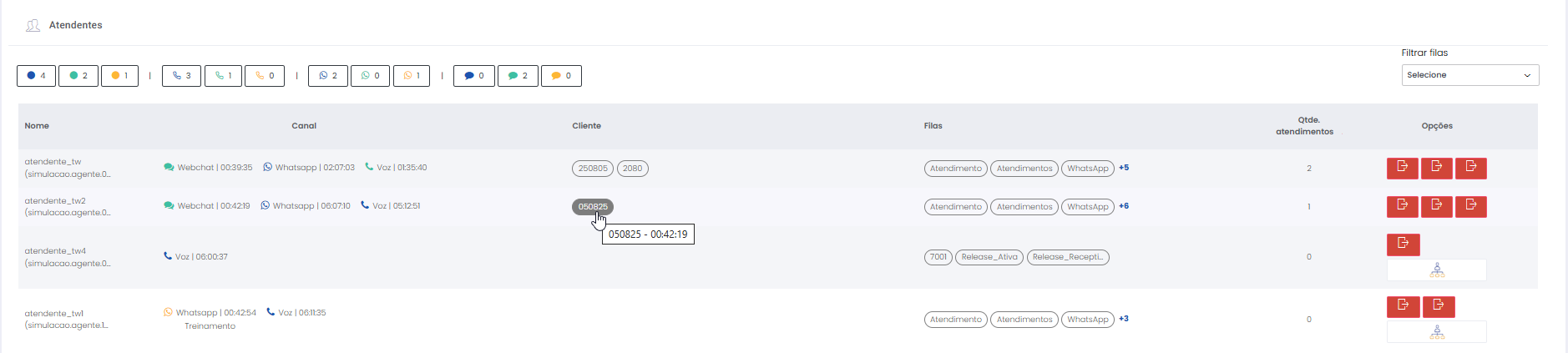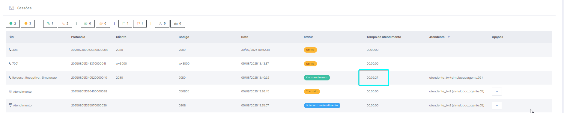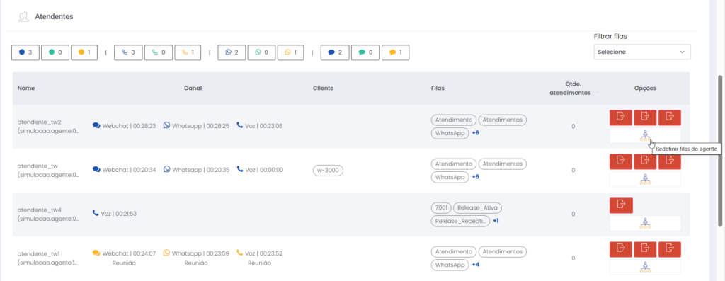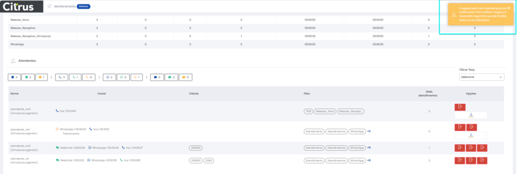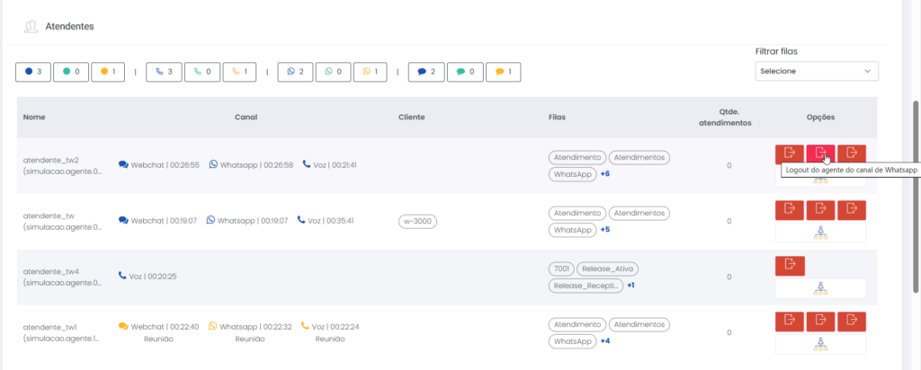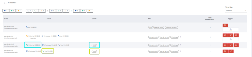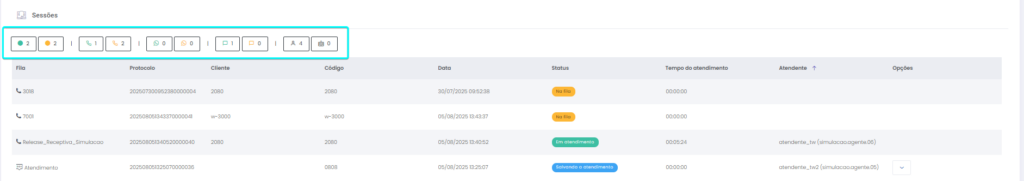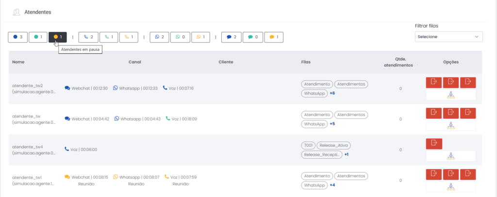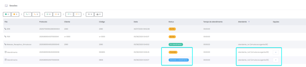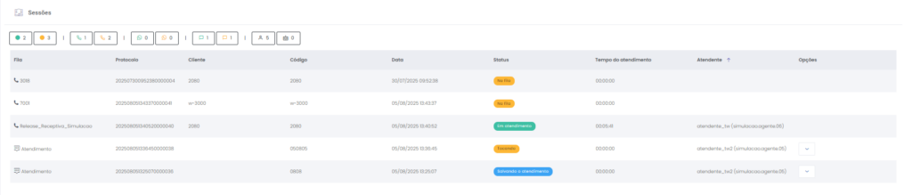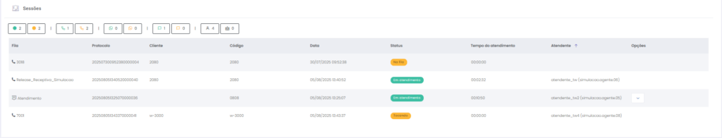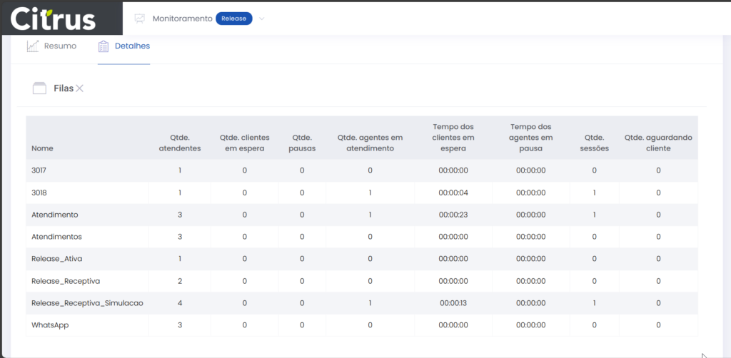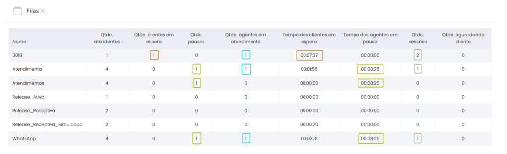 Detalhes dos atendimentos Estimated reading: 13 minutes 621 views 01/04/2025 Confira a Tabela de Versionamento Neste artigo você encontra informações dos seguintes painéis com Detalhes em tempo real do Grupo de monitoramento: Filas Atendentes Sessões A aba Detalhes funciona como um painel operacional que permite acompanhar em tempo real status das Filas, dos Atendentes e de Sessões em andamento.Por meio dela é possível ter uma visão precisa de informações sobre os atendimentos, como tempos de espera e de pausas, duração dos atendimentos, quantidade de clientes aguardando e disponibilidade de Atendentes.A partir dos indicadores apresentados o Supervisor consegue:Monitorar a ocupação dos Atendentes.Gerenciar a distribuição dos atendimentos.Acompanhar filas específicas de atendimento (Voz, WebChat e WhatsApp).Intervir rapidamente em situações críticas, como clientes esperando ou Atendentes indisponíveis. Principais benefíciosTomada de decisão rápida: Permite realocar recursos e priorizar atendimentos.Redução no tempo de espera: Ao monitorar as filas é possível atuar para reduzir/evitar gargalos.Aumento na produtividade: Identifica Atendentes ociosos, em atendimento ou excedendo tempo de pausa.Melhora na experiência do cliente: Garante agilidade no atendimento e manutenção da qualidade.Gestão eficiente: Gera dados precisos e atualizados sobre a operação. Visão geral da seção Filas. Visão geral da seção Atendentes. Visão geral das Sessões em andamento. As métricas do Grupo de monitoramento aparecem organizadas em três painéis, para facilitar o acompanhamento e análise pela supervisão: Filas Apresenta uma visão detalhada das filas de atendimento, permitindo identificar rapidamente a situação operacional.Entre as vantagens de acompanhar os indicadores desta seção estão: conseguir agir rapidamente em relação às filas com acúmulo de clientes em espera e/ou baixa disponibilidade de Atendentes.Os dados são distribuídos pelas colunas:Nome: Identificação da fila de atendimento.Qtde. atendentes: Número de Atendentes logados em cada fila.Qtde. clientes em espera: Quantos clientes estão aguardando por atendimento em cada fila.Qtde. pausas: Quantos Atendentes estão em pausa.Qtde. agentes em atendimento: Quantos Atendentes estão com atendimentos em andamento em cada fila.Tempo dos clientes em espera: Tempo Médio de Espera (TME) da fila. A informação exibida corresponde a todos os atendimentos do dia, até o momento em que a consulta está sendo feita. Tempo dos agentes em pausa: Tempo em que Atendentes da fila estão em pausa. A coluna mostra a soma dos tempos de pausa de todos os Atendentes da fila (que se encontram com este status). A medida que Atendentes saem das pausas, o tempo é subtraído, para que a informação apresentada sempre corresponda às pausas em andamento.Qtde. sessões: Quantas sessões de clientes encontram-se em progresso. Contabiliza tanto clientes em espera como os que estão em atendimento.Qtde. aguardando cliente: Clientes que estão sendo atendidos por Atendentes da fila, mas foram colocados em espera pelos Atendentes por estarem demorando muito para responder. Mostra clientes em espera em filas dos canais de Voz, WebChat e/ou WhatsApp). Indicadores da seção Filas. Atendentes Lista todos os Atendentes conectados (logados nas filas dos canais configurados no Grupo de monitoramento).Permite monitorar o status atual de cada Atendente e todos os atendimentos que estão sendo realizados.As métricas deste painel facilitam, por exemplo, a gestão da produtividade individual dos Atendentes e a identificação de quem está ocioso ou sobrecarregado.O topo da seção mostra um resumo com a visão geral sobre Atendentes e os canais de atendimento (do Grupo de monitoramento):Visão geral de Atendentes: Filtros clicáveis que mostram quantos estão disponíveis, em atendimento ou em pausa, considerando todas as filas dos canais configurados no Grupo de monitoramento.Webchat, WhatsApp e Voz: Filtros que listam para cada canal, as quantidades de:• Atendentes disponíveis.• Atendentes em atendimento.• Atendentes em pausa.Também no topo da seção fica um seletor para Filtrar filas. Por meio dele o Supervisor pode escolher qual fila associada ao Grupo de monitoramento deseja acompanhar. * Enquanto o Supervisor estiver utilizando o seletor de Filtrar filas a atualização automática da tela será pausada temporariamente, para que não seja interrompido por ela. Assim que fechar o seletor, a atualização automática é retomada. Confira a Release notes da versão 2.109.31. Em destaque, o resumo no topo da seção com o total de Atendentes Disponíveis. Resumo no topo da seção com o total de Atendentes Em atendimento. Resumo no topo da seção com o total de Atendentes em pausa. Resumo de status de Atendentes por canal. Seletor para Filtrar filas pelo nome, pelo número ou percorrendo a listagem. As informações de cada Atendente são apresentadas pelas colunas:Nome: Identificação do Atendente.Canal: Exibe em qual(is) canal(is) o Atendente está logado em alguma fila. Permite verificar se o Atendente encontra-se Disponivel para atender (azul), Em pausa (amarelo) ou Em atendimento (verde), e identifica o tempo correspondente ao status atual do Atendente para cada canal. • Caso o Atendente esteja atendendo em mais de uma fila do mesmo canal, o contador que aponta há quanto tempo se encontra em seu status atual exibirá a duração do atendimento iniciado há mais tempo. • O tempo em que o Atendente está Disponível para receber novos atendimentos (em cada canal) vai ser contabilizado a partir do momento em que o contato com o cliente for encerrado (desligar chamada/encerrar troca de mensagens em chats).Consulte todas as regras de funcionamento em Status do Monitoramento.Cliente: Enquanto um atendimento está acontecendo, identifica o cliente e o tempo de duração do atendimento. Um tooltip é carregado com o
