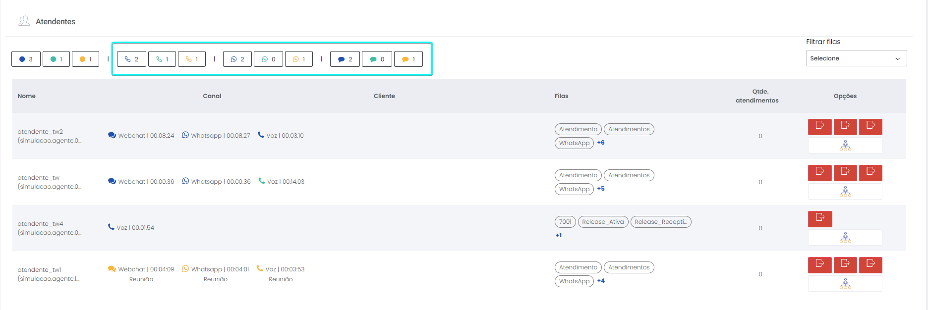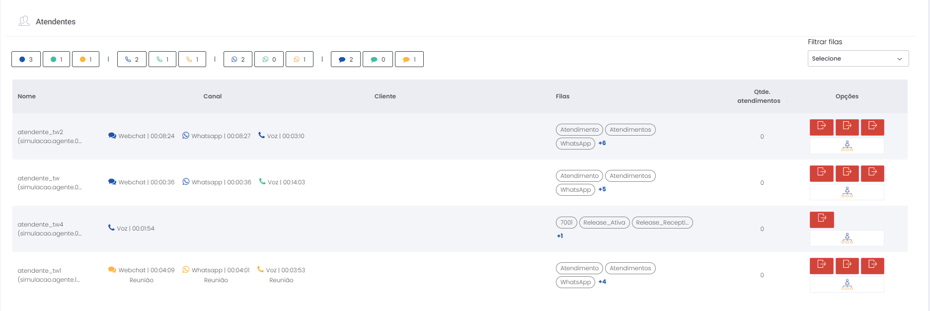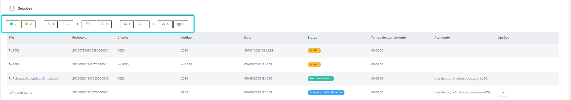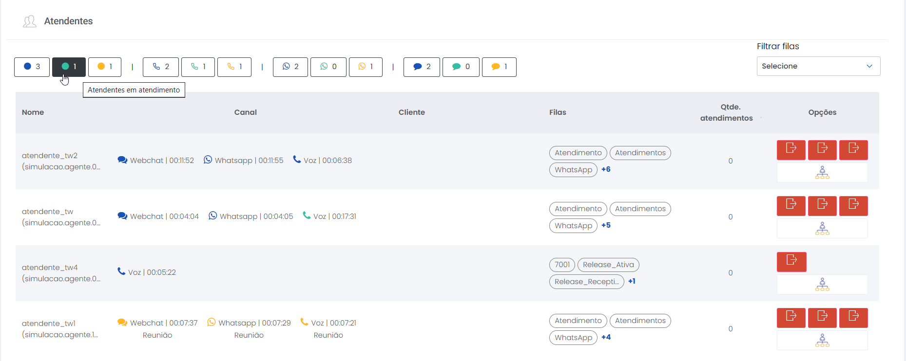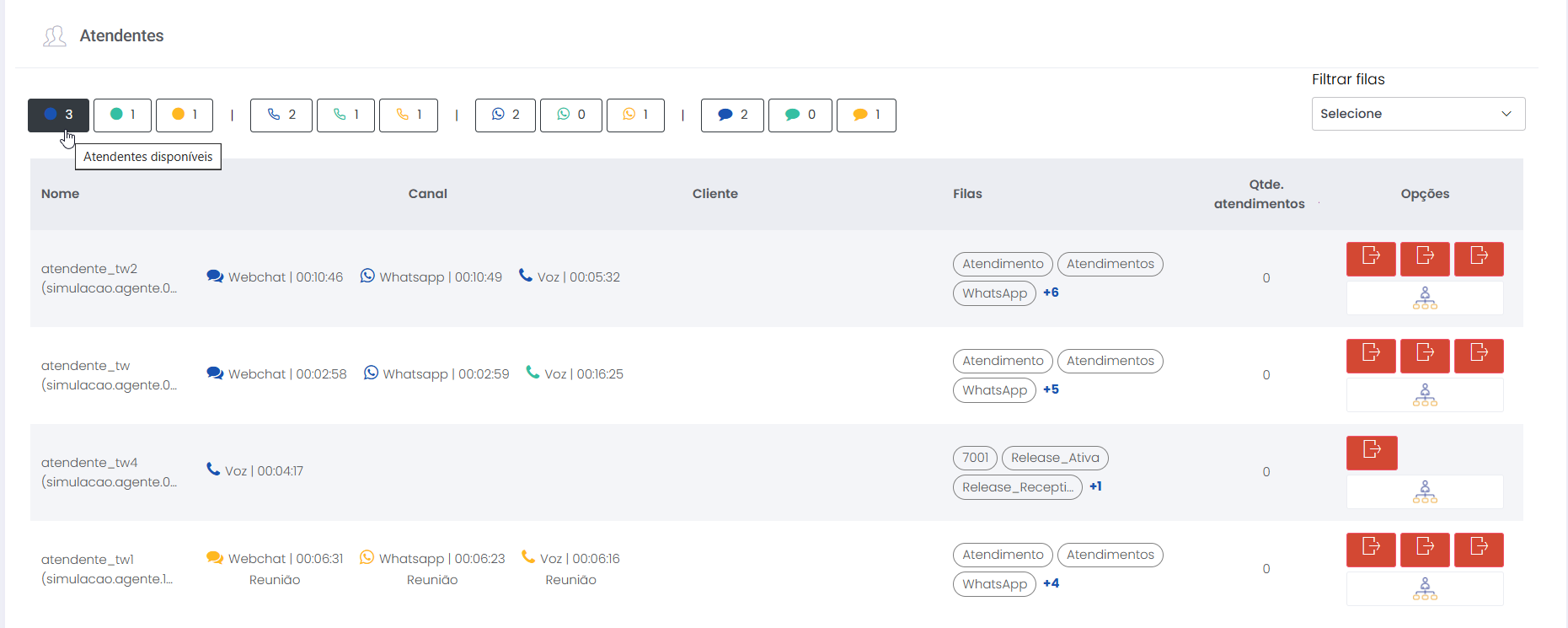 Detalhes dos atendimentos Estimated reading: 13 minutes 621 views 01/04/2025 Confira a Tabela de Versionamento Neste artigo você encontra informações dos seguintes painéis com Detalhes em tempo real do Grupo de monitoramento: Filas Atendentes Sessões A aba Detalhes funciona como um painel operacional que permite acompanhar em tempo real status das Filas, dos Atendentes e de Sessões em andamento.Por meio dela é possível ter uma visão precisa de informações sobre os atendimentos, como tempos de espera e de pausas, duração dos atendimentos, quantidade de clientes aguardando e disponibilidade de Atendentes.A partir dos indicadores apresentados o Supervisor consegue:Monitorar a ocupação dos Atendentes.Gerenciar a distribuição dos atendimentos.Acompanhar filas específicas de atendimento (Voz, WebChat e WhatsApp).Intervir rapidamente em situações críticas, como clientes esperando ou Atendentes indisponíveis. Principais benefíciosTomada de decisão rápida: Permite realocar recursos e priorizar atendimentos.Redução no tempo de espera: Ao monitorar as filas é possível atuar para reduzir/evitar gargalos.Aumento na produtividade: Identifica Atendentes ociosos, em atendimento ou excedendo tempo de pausa.Melhora na experiência do cliente: Garante agilidade no atendimento e manutenção da qualidade.Gestão eficiente: Gera dados precisos e atualizados sobre a operação. Visão geral da seção Filas. Visão geral da seção Atendentes. Visão geral das Sessões em andamento. As métricas do Grupo de monitoramento aparecem organizadas em três painéis, para facilitar o acompanhamento e análise pela supervisão: Filas Apresenta uma visão detalhada das filas de atendimento, permitindo identificar rapidamente a situação operacional.Entre as vantagens de acompanhar os indicadores desta seção estão: conseguir agir rapidamente em relação às filas com acúmulo de clientes em espera e/ou baixa disponibilidade de Atendentes.Os dados são distribuídos pelas colunas:Nome: Identificação da fila de atendimento.Qtde. atendentes: Número de Atendentes logados em cada fila.Qtde. clientes em espera: Quantos clientes estão aguardando por atendimento em cada fila.Qtde. pausas: Quantos Atendentes estão em pausa.Qtde. agentes em atendimento: Quantos Atendentes estão com atendimentos em andamento em cada fila.Tempo dos clientes em espera: Tempo Médio de Espera (TME) da fila. A informação exibida corresponde a todos os atendimentos do dia, até o momento em que a consulta está sendo feita. Tempo dos agentes em pausa: Tempo em que Atendentes da fila estão em pausa. A coluna mostra a soma dos tempos de pausa de todos os Atendentes da fila (que se encontram com este status). A medida que Atendentes saem das pausas, o tempo é subtraído, para que a informação apresentada sempre corresponda às pausas em andamento.Qtde. sessões: Quantas sessões de clientes encontram-se em progresso. Contabiliza tanto clientes em espera como os que estão em atendimento.Qtde. aguardando cliente: Clientes que estão sendo atendidos por Atendentes da fila, mas foram colocados em espera pelos Atendentes por estarem demorando muito para responder. Mostra clientes em espera em filas dos canais de Voz, WebChat e/ou WhatsApp). Indicadores da seção Filas. Atendentes Lista todos os Atendentes conectados (logados nas filas dos canais configurados no Grupo de monitoramento).Permite monitorar o status atual de cada Atendente e todos os atendimentos que estão sendo realizados.As métricas deste painel facilitam, por exemplo, a gestão da produtividade individual dos Atendentes e a identificação de quem está ocioso ou sobrecarregado.O topo da seção mostra um resumo com a visão geral sobre Atendentes e os canais de atendimento (do Grupo de monitoramento):Visão geral de Atendentes: Filtros clicáveis que mostram quantos estão disponíveis, em atendimento ou em pausa, considerando todas as filas dos canais configurados no Grupo de monitoramento.Webchat, WhatsApp e Voz: Filtros que listam para cada canal, as quantidades de:• Atendentes disponíveis.• Atendentes em atendimento.• Atendentes em pausa.Também no topo da seção fica um seletor para Filtrar filas. Por meio dele o Supervisor pode escolher qual fila associada ao Grupo de monitoramento deseja acompanhar. * Enquanto o Supervisor estiver utilizando o seletor de Filtrar filas a atualização automática da tela será pausada temporariamente, para que não seja interrompido por ela. Assim que fechar o seletor, a atualização automática é retomada. Confira a Release notes da versão 2.109.31. Em destaque, o resumo no topo da seção com o total de Atendentes Disponíveis. Resumo no topo da seção com o total de Atendentes Em atendimento. Resumo no topo da seção com o total de Atendentes em pausa. Resumo de status de Atendentes por canal. Seletor para Filtrar filas pelo nome, pelo número ou percorrendo a listagem. As informações de cada Atendente são apresentadas pelas colunas:Nome: Identificação do Atendente.Canal: Exibe em qual(is) canal(is) o Atendente está logado em alguma fila. Permite verificar se o Atendente encontra-se Disponivel para atender (azul), Em pausa (amarelo) ou Em atendimento (verde), e identifica o tempo correspondente ao status atual do Atendente para cada canal. • Caso o Atendente esteja atendendo em mais de uma fila do mesmo canal, o contador que aponta há quanto tempo se encontra em seu status atual exibirá a duração do atendimento iniciado há mais tempo. • O tempo em que o Atendente está Disponível para receber novos atendimentos (em cada canal) vai ser contabilizado a partir do momento em que o contato com o cliente for encerrado (desligar chamada/encerrar troca de mensagens em chats).Consulte todas as regras de funcionamento em Status do Monitoramento.Cliente: Enquanto um atendimento está acontecendo, identifica o cliente e o tempo de duração do atendimento. Um tooltip é carregado com o