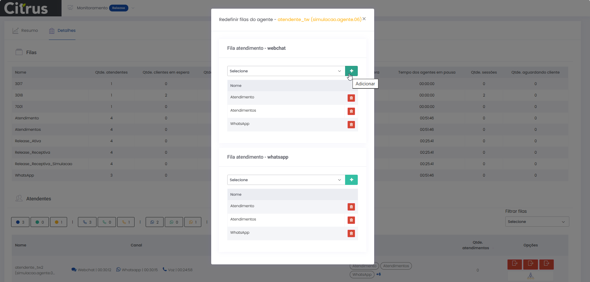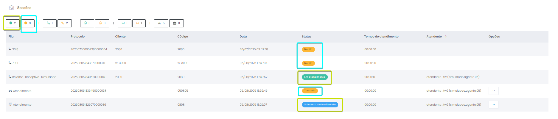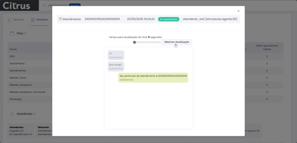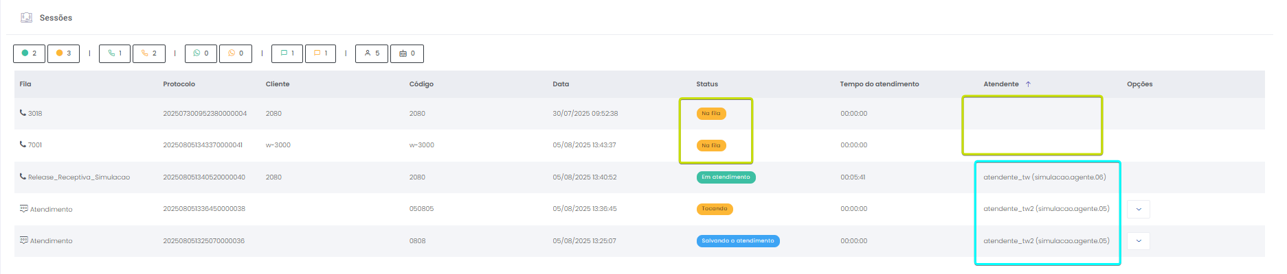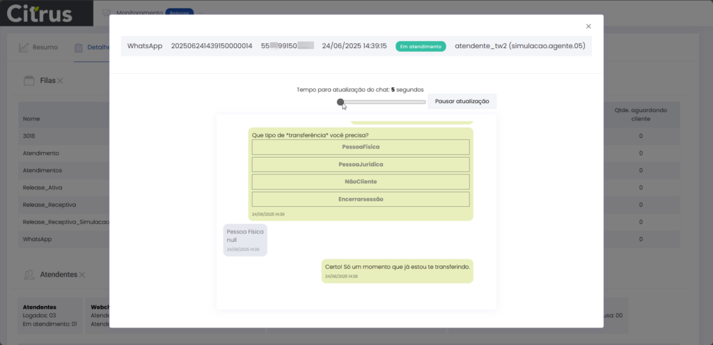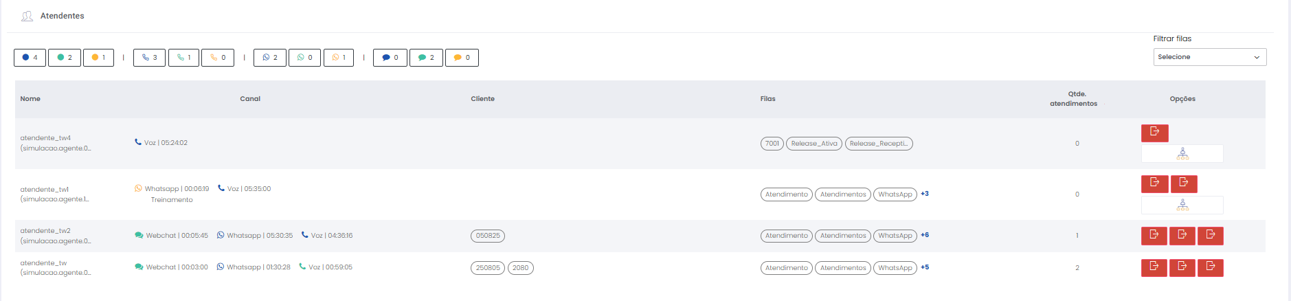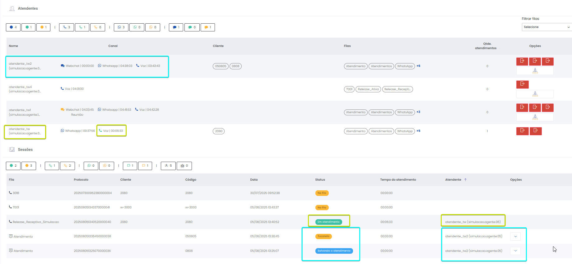 Detalhes dos atendimentos Estimated reading: 13 minutes 621 views 01/04/2025 Confira a Tabela de Versionamento Neste artigo você encontra informações dos seguintes painéis com Detalhes em tempo real do Grupo de monitoramento: Filas Atendentes Sessões A aba Detalhes funciona como um painel operacional que permite acompanhar em tempo real status das Filas, dos Atendentes e de Sessões em andamento.Por meio dela é possível ter uma visão precisa de informações sobre os atendimentos, como tempos de espera e de pausas, duração dos atendimentos, quantidade de clientes aguardando e disponibilidade de Atendentes.A partir dos indicadores apresentados o Supervisor consegue:Monitorar a ocupação dos Atendentes.Gerenciar a distribuição dos atendimentos.Acompanhar filas específicas de atendimento (Voz, WebChat e WhatsApp).Intervir rapidamente em situações críticas, como clientes esperando ou Atendentes indisponíveis. Principais benefíciosTomada de decisão rápida: Permite realocar recursos e priorizar atendimentos.Redução no tempo de espera: Ao monitorar as filas é possível atuar para reduzir/evitar gargalos.Aumento na produtividade: Identifica Atendentes ociosos, em atendimento ou excedendo tempo de pausa.Melhora na experiência do cliente: Garante agilidade no atendimento e manutenção da qualidade.Gestão eficiente: Gera dados precisos e atualizados sobre a operação. Visão geral da seção Filas. Visão geral da seção Atendentes. Visão geral das Sessões em andamento. As métricas do Grupo de monitoramento aparecem organizadas em três painéis, para facilitar o acompanhamento e análise pela supervisão: Filas Apresenta uma visão detalhada das filas de atendimento, permitindo identificar rapidamente a situação operacional.Entre as vantagens de acompanhar os indicadores desta seção estão: conseguir agir rapidamente em relação às filas com acúmulo de clientes em espera e/ou baixa disponibilidade de Atendentes.Os dados são distribuídos pelas colunas:Nome: Identificação da fila de atendimento.Qtde. atendentes: Número de Atendentes logados em cada fila.Qtde. clientes em espera: Quantos clientes estão aguardando por atendimento em cada fila.Qtde. pausas: Quantos Atendentes estão em pausa.Qtde. agentes em atendimento: Quantos Atendentes estão com atendimentos em andamento em cada fila.Tempo dos clientes em espera: Tempo Médio de Espera (TME) da fila. A informação exibida corresponde a todos os atendimentos do dia, até o momento em que a consulta está sendo feita. Tempo dos agentes em pausa: Tempo em que Atendentes da fila estão em pausa. A coluna mostra a soma dos tempos de pausa de todos os Atendentes da fila (que se encontram com este status). A medida que Atendentes saem das pausas, o tempo é subtraído, para que a informação apresentada sempre corresponda às pausas em andamento.Qtde. sessões: Quantas sessões de clientes encontram-se em progresso. Contabiliza tanto clientes em espera como os que estão em atendimento.Qtde. aguardando cliente: Clientes que estão sendo atendidos por Atendentes da fila, mas foram colocados em espera pelos Atendentes por estarem demorando muito para responder. Mostra clientes em espera em filas dos canais de Voz, WebChat e/ou WhatsApp). Indicadores da seção Filas. Atendentes Lista todos os Atendentes conectados (logados nas filas dos canais configurados no Grupo de monitoramento).Permite monitorar o status atual de cada Atendente e todos os atendimentos que estão sendo realizados.As métricas deste painel facilitam, por exemplo, a gestão da produtividade individual dos Atendentes e a identificação de quem está ocioso ou sobrecarregado.O topo da seção mostra um resumo com a visão geral sobre Atendentes e os canais de atendimento (do Grupo de monitoramento):Visão geral de Atendentes: Filtros clicáveis que mostram quantos estão disponíveis, em atendimento ou em pausa, considerando todas as filas dos canais configurados no Grupo de monitoramento.Webchat, WhatsApp e Voz: Filtros que listam para cada canal, as quantidades de:• Atendentes disponíveis.• Atendentes em atendimento.• Atendentes em pausa.Também no topo da seção fica um seletor para Filtrar filas. Por meio dele o Supervisor pode escolher qual fila associada ao Grupo de monitoramento deseja acompanhar. * Enquanto o Supervisor estiver utilizando o seletor de Filtrar filas a atualização automática da tela será pausada temporariamente, para que não seja interrompido por ela. Assim que fechar o seletor, a atualização automática é retomada. Confira a Release notes da versão 2.109.31. Em destaque, o resumo no topo da seção com o total de Atendentes Disponíveis. Resumo no topo da seção com o total de Atendentes Em atendimento. Resumo no topo da seção com o total de Atendentes em pausa. Resumo de status de Atendentes por canal. Seletor para Filtrar filas pelo nome, pelo número ou percorrendo a listagem. As informações de cada Atendente são apresentadas pelas colunas:Nome: Identificação do Atendente.Canal: Exibe em qual(is) canal(is) o Atendente está logado em alguma fila. Permite verificar se o Atendente encontra-se Disponivel para atender (azul), Em pausa (amarelo) ou Em atendimento (verde), e identifica o tempo correspondente ao status atual do Atendente para cada canal. • Caso o Atendente esteja atendendo em mais de uma fila do mesmo canal, o contador que aponta há quanto tempo se encontra em seu status atual exibirá a duração do atendimento iniciado há mais tempo. • O tempo em que o Atendente está Disponível para receber novos atendimentos (em cada canal) vai ser contabilizado a partir do momento em que o contato com o cliente for encerrado (desligar chamada/encerrar troca de mensagens em chats).Consulte todas as regras de funcionamento em Status do Monitoramento.Cliente: Enquanto um atendimento está acontecendo, identifica o cliente e o tempo de duração do atendimento. Um tooltip é carregado com o
