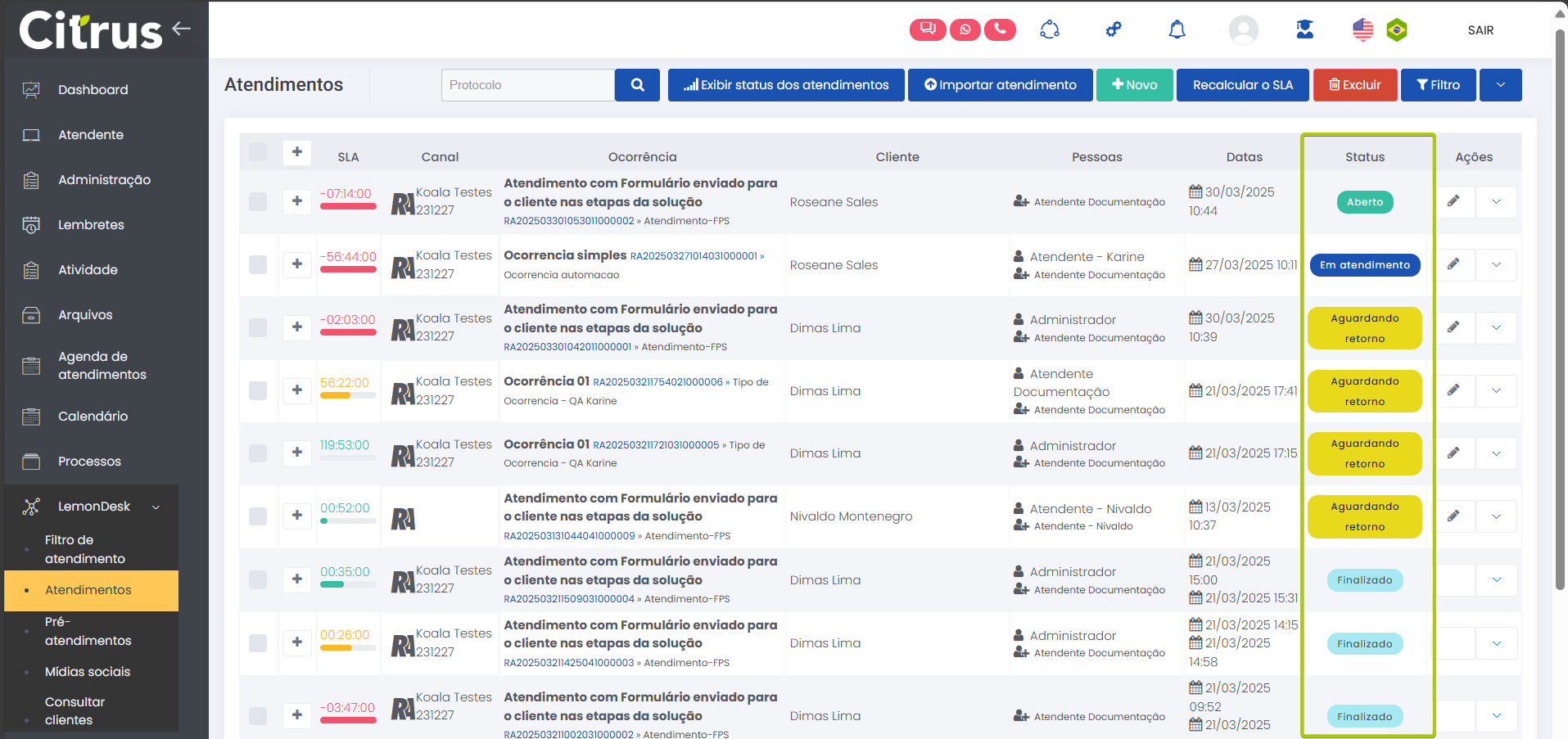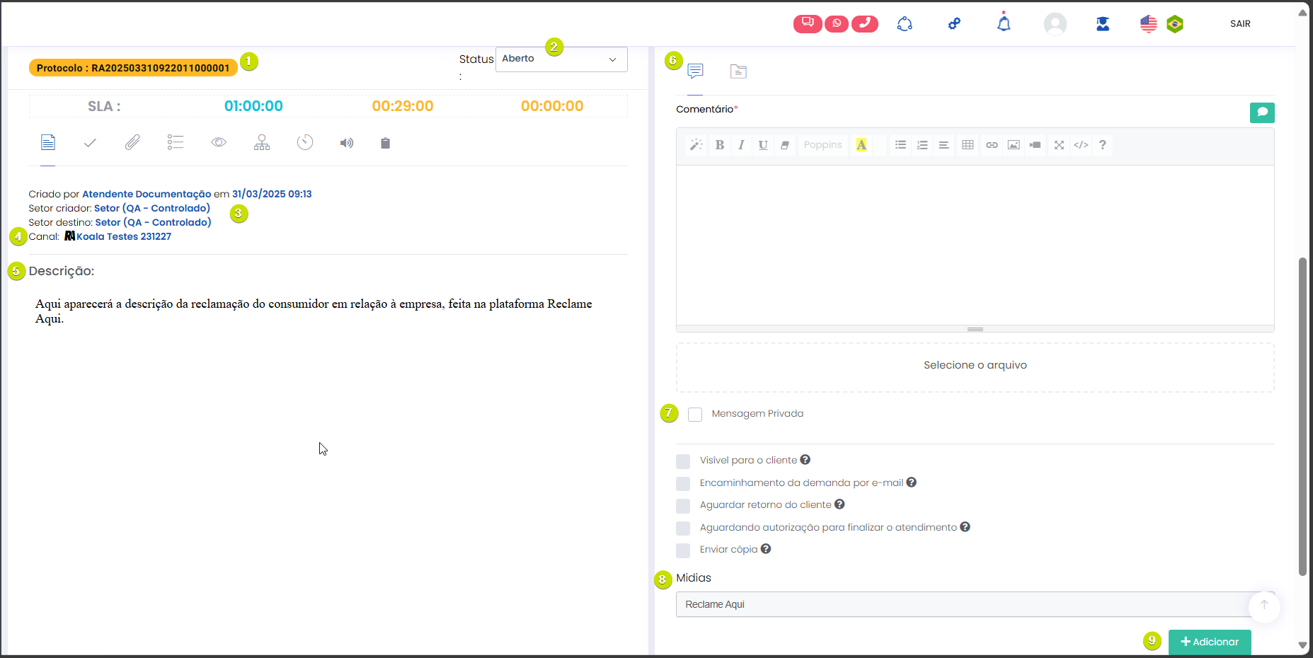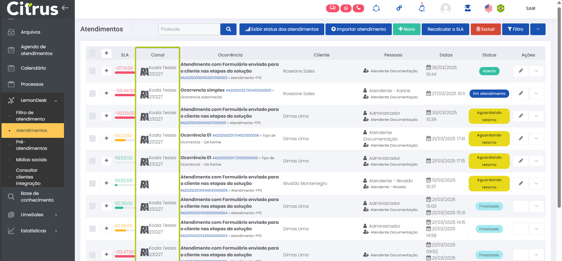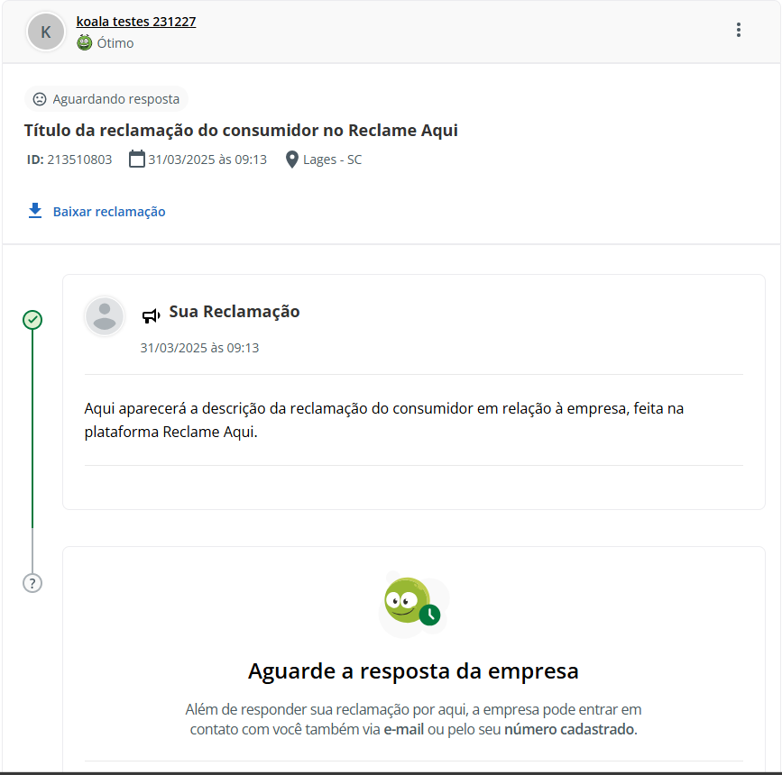 Atendimento Estimated reading: 4 minutes 241 views 06/03/2025 Reclame Aqui na tela de Atendimentos Ao acessar a tela de Atendimentos (LemonDesk > Atendimentos), o Atendente poderá identificar os do canal pelo ícone padrão e pelo nome da página da empresa no Reclame Aqui. Estas informações ficam visíveis na coluna “Canal”: Além dessa identificação inicial e de outros dados descritos pelas demais colunas (padrão para todos os canais), o Atendente pode verificar o status dos atendimentos. Os atendimentos do Reclame Aqui serão classificados com os seguintes status: Aberto: A reclamação foi aberta no Reclame Aqui e sincronizada com a plataforma Citrus, mas nenhum Atendente da empresa iniciou o atendimento.“Em atendimento”: A reclamação está sendo tratada por um Atendente no Citrus. “Aguardando Retorno”: A empresa já respondeu o cliente e aguarda um retorno, que pode ser uma nova mensagem do cliente ou a finalização do atendimento porque o cliente encerrou a reclamação. “Finalizado”: A reclamação foi encerrada no Reclame Aqui pelo cliente (que abriu a queixa) ou pelo próprio Reclame Aqui. Somente o cliente que abriu a reclamação ou o próprio Reclame Aqui podem encerrar uma reclamação, o que vai alterar o status de um atendimento no Citrus para “Finalizado”. Confira quando uma reclamação é encerrada na plataforma Reclame Aqui em Perguntas Frequentes. Visualizando o atendimento gerado no Citrus Sempre que um consumidor registrar uma reclamação sobre a empresa na plataforma Reclame Aqui, um atendimento será criado no Citrus com o status “Aberto”, respeitando o “Intervalo de sincronia” definido na configuração de integração do canal. Ao acessar o atendimento o Atendente visualizará: Número do Protocolo do atendimento no Citrus. Status do atendimento. Grupo de informações gerado a partir das definições sobre conversão automática de pré-atendimento em atendimento, na configuração de integração do canal. Nome da página da empresa no Reclame Aqui, na qual o consumidor publicou a reclamação. Conteúdo da reclamação feita pelo consumidor. IMPORTANTE: Os atendimentos no Citrus não exibem anexos inseridos pelo consumidor na reclamação feita no Reclame Aqui. Seção de Comentários, para o Atendente adicionar as mensagens que serão enviadas como respostas para o consumidor visualizar na plataforma Reclame Aqui. Grupo de opções de configuração para os comentários dos Atendentes. “Mídias”: Este campo aparecerá automaticamente preenchido com o nome do canal do atendimento. IMPORTANTE: A identificação de “Mídias”, indicando a plataforma que originou o atendimento, precisa estar habilitada no perfil do Atendente para que apareça automaticamente registrada. Caso o recurso não esteja configurado, o Atendente poderá usar o seletor do campo para escolher o canal.Confira mais informações sobre o recurso na Release notes da versão 2.113.1. Botão +Adicionar que deve ser utilizado a cada comentário criado pelo Atendente, para enviá-lo ao consumidor no Reclame Aqui e para que a mensagem fique registrada no histórico do atendimento. Veja no exemplo como o consumidor visualiza a reclamação no Reclame Aqui, enquanto ainda não foi respondida pela empresa. Confira como Atender pelo canal Reclame Aqui Consulte o Guia de Configuração Confira as Perguntas Frequentes × Clique nas imagens desta página para vê-las em tela cheia. Se preferir, recolha o menu da lateral esquerda da página para uma melhor visualização de imagens e vídeos. Artigos relacionadosAtender pelo canal Reclame Aqui Tagged:Atender no Reclame AquiAtendimento nota 10 no Reclame AquiAtendimento Reclame AquiAtendimento Reclame Aqui para empresasAumentar Solução no Reclame AquiCanal Reclame AquiCanal Reclame Aqui no CitrusCitrus Canal Reclame AquiComo Atender Reclame AquiComo aumentar o índice de solução no Reclame AquComo Realizar Atendimento Reclame AquiDúvidas sobre Reclame AquiFAQ Reclame AquiFinalizar Atendimento Reclame AquiGuias do Reclame AquiPasso a passo para responder no Reclame AquiPerguntas Frequentes sobre Reclame AquiQuanto tempo tenho para responder no Reclame AquiReclame Aqui CitrusReclame Aqui como responder reclamaçõesResolver Reclamação no Reclame AquiResponder cliente no Reclame AquiResponder Consumidor no Reclame AquiResponder Reclamações no Reclame Aqui