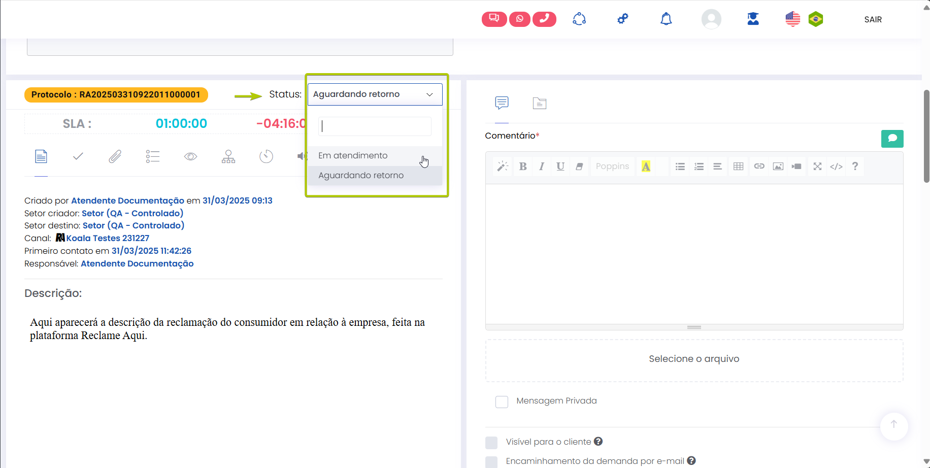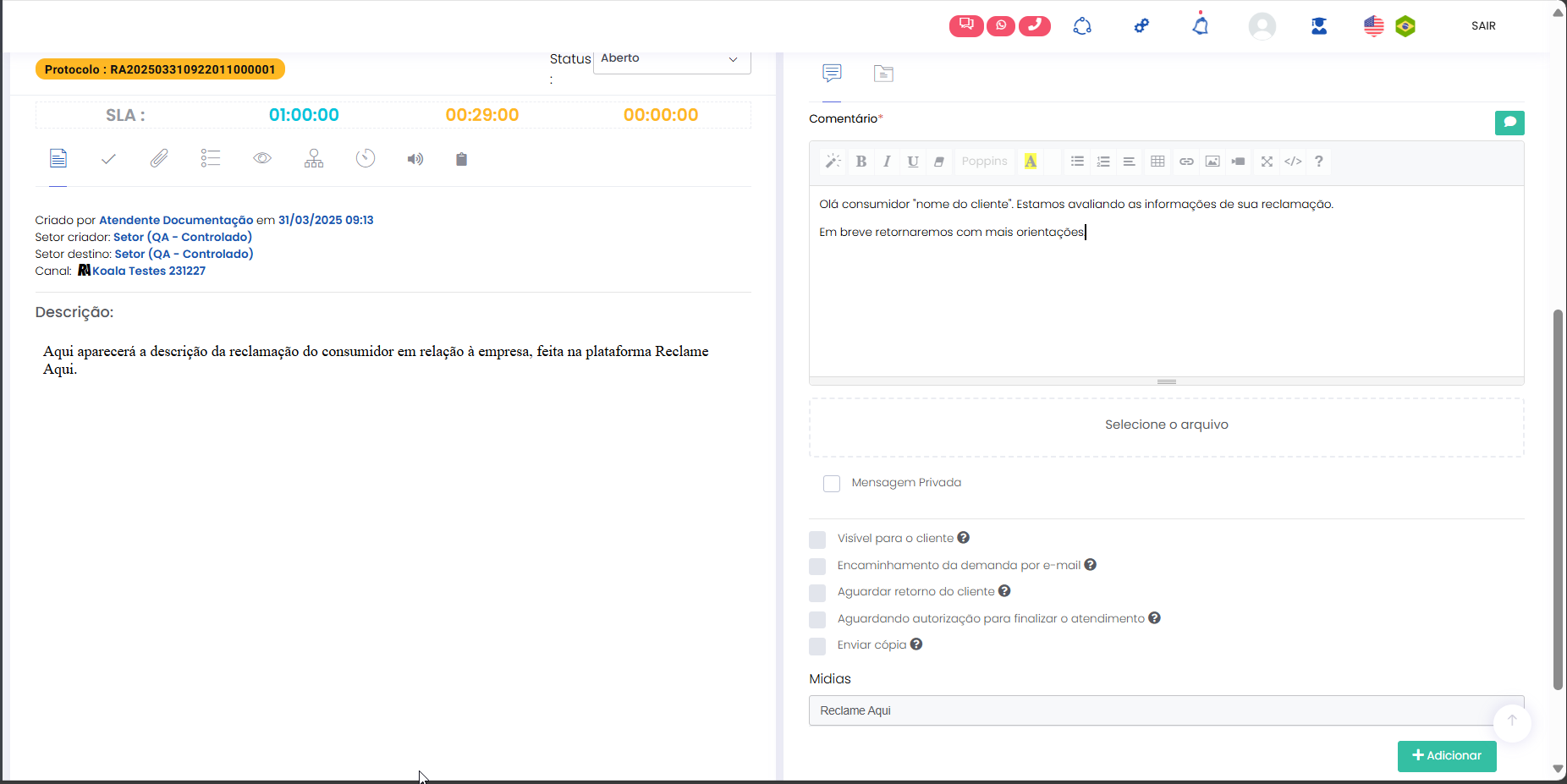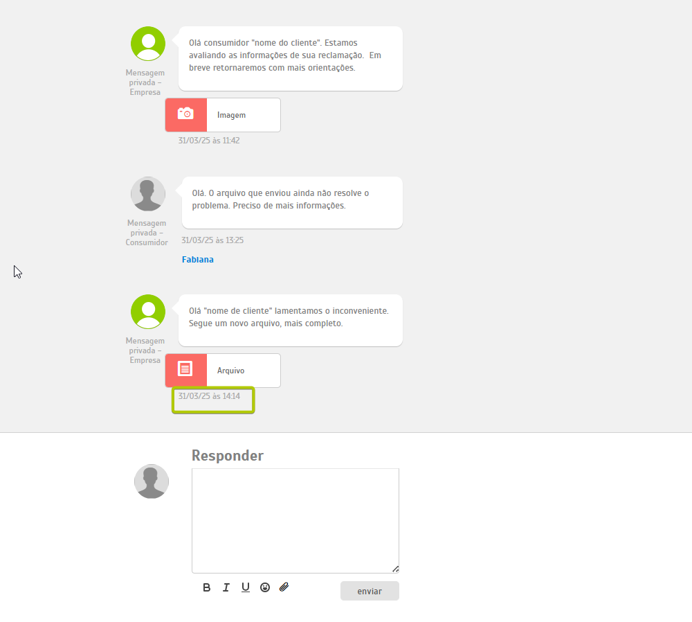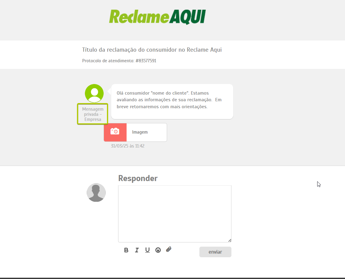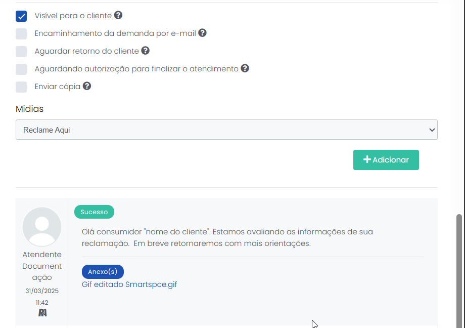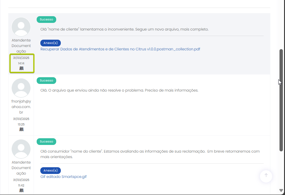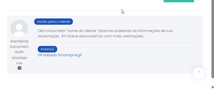 Atender pelo canal Reclame Aqui Estimated reading: 4 minutes 311 views 06/03/2025 Confira a Tabela de Versionamento Na seção Comentários escreva o conteúdo da resposta que será enviada para o consumidor visualizar na plataforma Reclame Aqui. Anexos: Se desejar inserir anexo(s) pressione o botão Selecione o arquivo. É possível adicionar anexo(s) até 3 MB. *Caso o(s) arquivo(s) ultrapasse(m) o limite, um alerta será exibido na tela, lembrando a regra. IMPORTANTE IMPORTANTE: Respostas que contenham anexo(s) não ficarão públicas no Reclame Aqui, sendo exibidas de forma privada apenas para o consumidor que registrou a reclamação e está sendo respondido. Ao inserir um anexo, a opção “Mensagem Privada” (abaixo do campo de comentário) será automaticamente habilitada, e a tela exibirá o alerta “Respostas com anexos são visíveis apenas em respostas privadas.” A opção não poderá ser desabilitada, a menos que o(s) anexo(s) sejam removidos antes de adicionar a resposta.. “Visível para o cliente”: Marque a caixa de seleção da opção se desejar que o comentário seja publicado na plataforma Reclame Aqui para o consumidor, no histórico da reclamação. Um pop-up questionará se quer realmente enviar o comentário para o cliente. Confirme clicando em “Sim”. Ao fazer isso, o comentário aparecerá no histórico de atendimento como “Sucesso” e o consumidor o verá no histórico da reclamação no Reclame Aqui. A resposta será exibida no Reclame Aqui de acordo com o “Intervalo de sincronia” configurado na Integração do canal . Quando a opção “Visível para o cliente” não for habilitada, o comentário ficará registrado apenas no histórico do atendimento no Citrus como “Oculto para o cliente”. O comentário “Oculto para o cliente” não pode ser revertido em “Visível para o cliente”, sendo necessário criar outro comentário e marcar a opção para ficar visível. Aguardando retorno: Assim que o primeiro comentário de resposta da empresa for adicionado ao atendimento como “Visível para o cliente” o status do atendimento no Citrus será atualizado para “Aguardando retorno”. IMPORTANTE IMPORTANTE: Se o Atendente inserir novos comentários em um atendimento com status “Aguardando retorno” no Citrus, as novas mensagens serão incorporadas ao atendimento e o status do card no Citrus será atualizado para “Em atendimento”. Consulte Perguntas Frequentes. Encaminhamento da demanda por e-mail: O Atendente poderá habilitar essa opção para esclarecer dúvidas com outras áreas da empresa antes de responder o cliente. Ao marcar a caixa de seleção, um bloco de Lembrete será exibido, exigindo que o Atendente selecione em quanto "Tempo” o sistema deve emitir um lembrete sobre este comentário (em minutos, horas ou dias), e o “Motivo”. As mensagens podem conter texto e anexo e todas ficarão registradas nos Comentários do atendimento como histórico, identificando Remetente e Destinatário. O funcionamento do recurso respeitará os seguintes critérios: • O e-mail pode ser encaminhado para um ou para múltiplos destinatários. • O(s) endereço(s) de e-mail que devem receber a mensagem podem ser preenchidos manualmente ou pela busca na lista de Destinatários de E-mails. • As respostas recebidas para um e-mail ficarão agrupadas junto dele nos comentários do atendimento e identificarão Remetente e Destinatário. • O Atendente pode enviar quantos e-mails forem necessários, com assuntos diferentes, para áreas distintas da empresa. • O lembrete não altera o status do atendimento. • O lembrete chegará para o Atendente por e-mail. Além disso, ficará visível pelo ícone de sino no topo da tela ao abrir o atendimento, após o tempo que foi definido para ser exibido. Desaparecerá do "sino" quando o Atendente clicar em Abrir atendimento na notificação. Só então aparecerá nos comentários do atendimento. • Se o Atendente marcar a opção “Visível para o cliente”, a resposta seguirá também para o cliente no Reclame Aqui. • Respostas para e-mails recebidas após o atendimento ter sido “Finalizado” serão registradas no histórico de comentários, sem alterar o status do atendimento. Encaminhamento da demanda por e-mail" Essa demonstração é meramente explicativa. . Aguardar retorno do cliente: Quando habilitada permite que o Atendente configure um Lembrete para ser notificado quando o cliente der algum retorno para a resposta enviada para ele no Reclame Aqui, pelo atendimento. *Caso o status do atendimento seja “Em atendimento”, ao marcar a opção o status será atualizado para “Aguardando retorno”, pois ao habilitá-la, automaticamente o sistema ativará a opção “Visível para o cliente” e enviará uma resposta para o consumidor no Reclame Aqui. O lembrete será exibido pelo ícone de sino no topo da tela de Atendimentos. O Atendente pode clicar para abrir /atualizar o atendimento relacionado com o novo comentário, ou, pressionar “Marcar como visualizado”. Atualização de status: Observe que ao receber um novo comentário do cliente (réplica), o status do atendimento é atualizado de “Aguardando retorno” para “Em atendimento”. Esse fluxo se repetirá toda vez que o Atendente (pelo Citrus) ou o cliente (pelo Reclame Aqui) replicarem respostas para comentários recebidos. As mensagens aparecerão salvas no histórico do atendimento no Citrus e na reclamação no Reclame Aqui. < Histórico do atendimento no Citrus. Histórico do atendimento no Reclame Aqui. IMPORTANTE IMPORTANTE: As mensagens de Atendentes são enviadas ao Reclame Aqui em tempo real. Por isso, nas imagens acima é possível ver que o horário de registro do comentário do Atendente no Citrus é o mesmo no histórico da reclamação no Reclame Aqui. Assim como os horários dos comentários do cliente. Ou seja, os dados entre as plataformas são sincronizados e atualizados no “intervalo de s