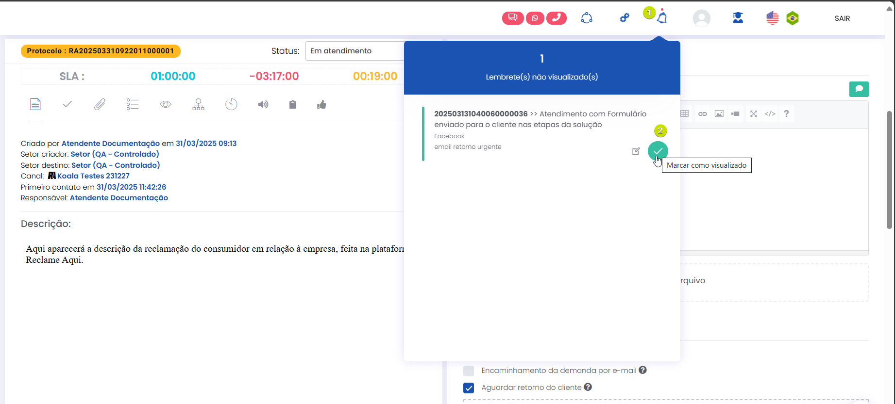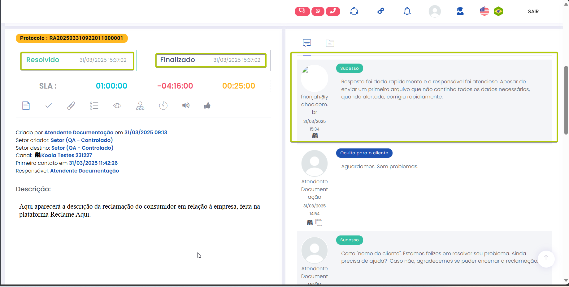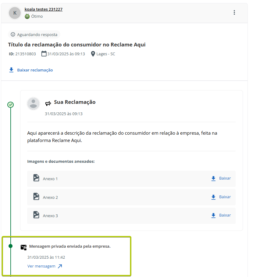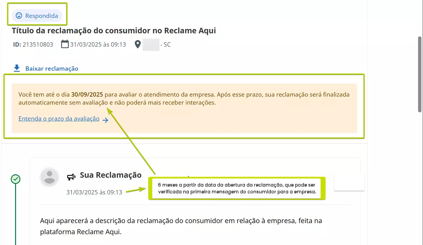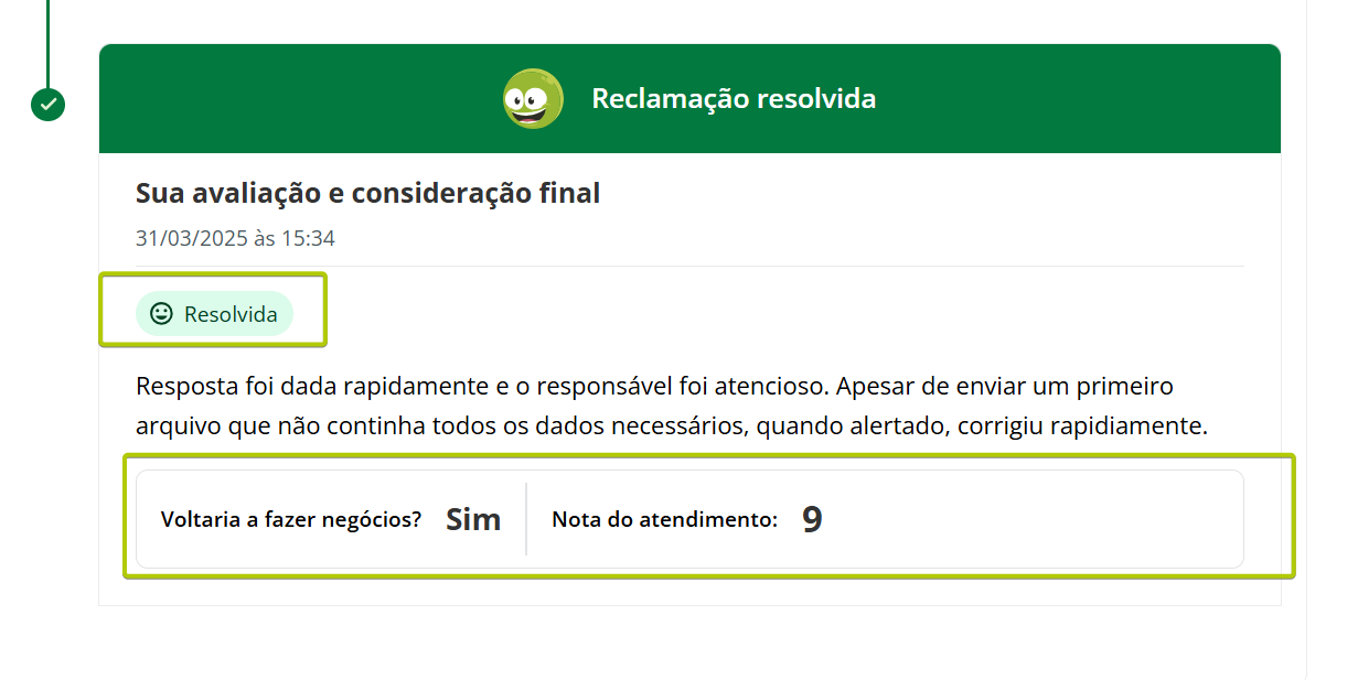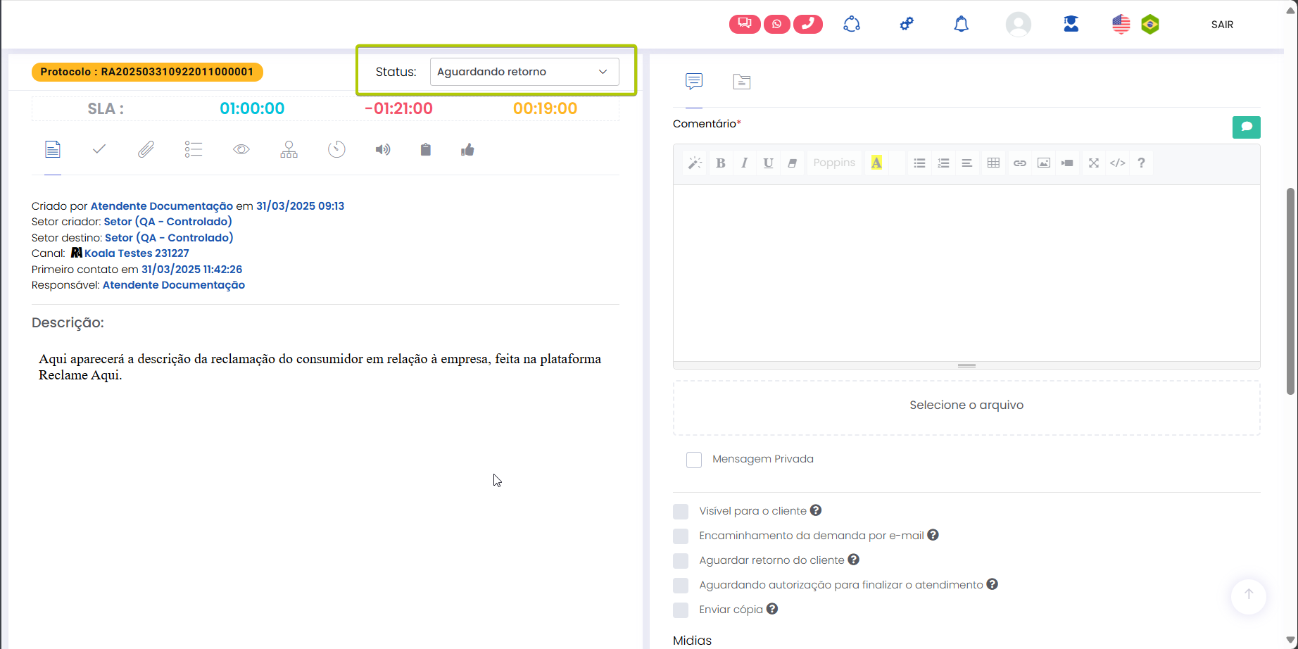 Atender pelo canal Reclame Aqui Estimated reading: 4 minutes 311 views 06/03/2025 Confira a Tabela de Versionamento Na seção Comentários escreva o conteúdo da resposta que será enviada para o consumidor visualizar na plataforma Reclame Aqui. Anexos: Se desejar inserir anexo(s) pressione o botão Selecione o arquivo. É possível adicionar anexo(s) até 3 MB. *Caso o(s) arquivo(s) ultrapasse(m) o limite, um alerta será exibido na tela, lembrando a regra. IMPORTANTE IMPORTANTE: Respostas que contenham anexo(s) não ficarão públicas no Reclame Aqui, sendo exibidas de forma privada apenas para o consumidor que registrou a reclamação e está sendo respondido. Ao inserir um anexo, a opção “Mensagem Privada” (abaixo do campo de comentário) será automaticamente habilitada, e a tela exibirá o alerta “Respostas com anexos são visíveis apenas em respostas privadas.” A opção não poderá ser desabilitada, a menos que o(s) anexo(s) sejam removidos antes de adicionar a resposta.. “Visível para o cliente”: Marque a caixa de seleção da opção se desejar que o comentário seja publicado na plataforma Reclame Aqui para o consumidor, no histórico da reclamação. Um pop-up questionará se quer realmente enviar o comentário para o cliente. Confirme clicando em “Sim”. Ao fazer isso, o comentário aparecerá no histórico de atendimento como “Sucesso” e o consumidor o verá no histórico da reclamação no Reclame Aqui. A resposta será exibida no Reclame Aqui de acordo com o “Intervalo de sincronia” configurado na Integração do canal . Quando a opção “Visível para o cliente” não for habilitada, o comentário ficará registrado apenas no histórico do atendimento no Citrus como “Oculto para o cliente”. O comentário “Oculto para o cliente” não pode ser revertido em “Visível para o cliente”, sendo necessário criar outro comentário e marcar a opção para ficar visível. Aguardando retorno: Assim que o primeiro comentário de resposta da empresa for adicionado ao atendimento como “Visível para o cliente” o status do atendimento no Citrus será atualizado para “Aguardando retorno”. IMPORTANTE IMPORTANTE: Se o Atendente inserir novos comentários em um atendimento com status “Aguardando retorno” no Citrus, as novas mensagens serão incorporadas ao atendimento e o status do card no Citrus será atualizado para “Em atendimento”. Consulte Perguntas Frequentes. Encaminhamento da demanda por e-mail: O Atendente poderá habilitar essa opção para esclarecer dúvidas com outras áreas da empresa antes de responder o cliente. Ao marcar a caixa de seleção, um bloco de Lembrete será exibido, exigindo que o Atendente selecione em quanto "Tempo” o sistema deve emitir um lembrete sobre este comentário (em minutos, horas ou dias), e o “Motivo”. As mensagens podem conter texto e anexo e todas ficarão registradas nos Comentários do atendimento como histórico, identificando Remetente e Destinatário. O funcionamento do recurso respeitará os seguintes critérios: • O e-mail pode ser encaminhado para um ou para múltiplos destinatários. • O(s) endereço(s) de e-mail que devem receber a mensagem podem ser preenchidos manualmente ou pela busca na lista de Destinatários de E-mails. • As respostas recebidas para um e-mail ficarão agrupadas junto dele nos comentários do atendimento e identificarão Remetente e Destinatário. • O Atendente pode enviar quantos e-mails forem necessários, com assuntos diferentes, para áreas distintas da empresa. • O lembrete não altera o status do atendimento. • O lembrete chegará para o Atendente por e-mail. Além disso, ficará visível pelo ícone de sino no topo da tela ao abrir o atendimento, após o tempo que foi definido para ser exibido. Desaparecerá do "sino" quando o Atendente clicar em Abrir atendimento na notificação. Só então aparecerá nos comentários do atendimento. • Se o Atendente marcar a opção “Visível para o cliente”, a resposta seguirá também para o cliente no Reclame Aqui. • Respostas para e-mails recebidas após o atendimento ter sido “Finalizado” serão registradas no histórico de comentários, sem alterar o status do atendimento. Encaminhamento da demanda por e-mail" Essa demonstração é meramente explicativa. . Aguardar retorno do cliente: Quando habilitada permite que o Atendente configure um Lembrete para ser notificado quando o cliente der algum retorno para a resposta enviada para ele no Reclame Aqui, pelo atendimento. *Caso o status do atendimento seja “Em atendimento”, ao marcar a opção o status será atualizado para “Aguardando retorno”, pois ao habilitá-la, automaticamente o sistema ativará a opção “Visível para o cliente” e enviará uma resposta para o consumidor no Reclame Aqui. O lembrete será exibido pelo ícone de sino no topo da tela de Atendimentos. O Atendente pode clicar para abrir /atualizar o atendimento relacionado com o novo comentário, ou, pressionar “Marcar como visualizado”. Atualização de status: Observe que ao receber um novo comentário do cliente (réplica), o status do atendimento é atualizado de “Aguardando retorno” para “Em atendimento”. Esse fluxo se repetirá toda vez que o Atendente (pelo Citrus) ou o cliente (pelo Reclame Aqui) replicarem respostas para comentários recebidos. As mensagens aparecerão salvas no histórico do atendimento no Citrus e na reclamação no Reclame Aqui. < Histórico do atendimento no Citrus. Histórico do atendimento no Reclame Aqui. IMPORTANTE IMPORTANTE: As mensagens de Atendentes são enviadas ao Reclame Aqui em tempo real. Por isso, nas imagens acima é possível ver que o horário de registro do comentário do Atendente no Citrus é o mesmo no histórico da reclamação no Reclame Aqui. Assim como os horários dos comentários do cliente. Ou seja, os dados entre as plataformas são sincronizados e atualizados no “intervalo de s