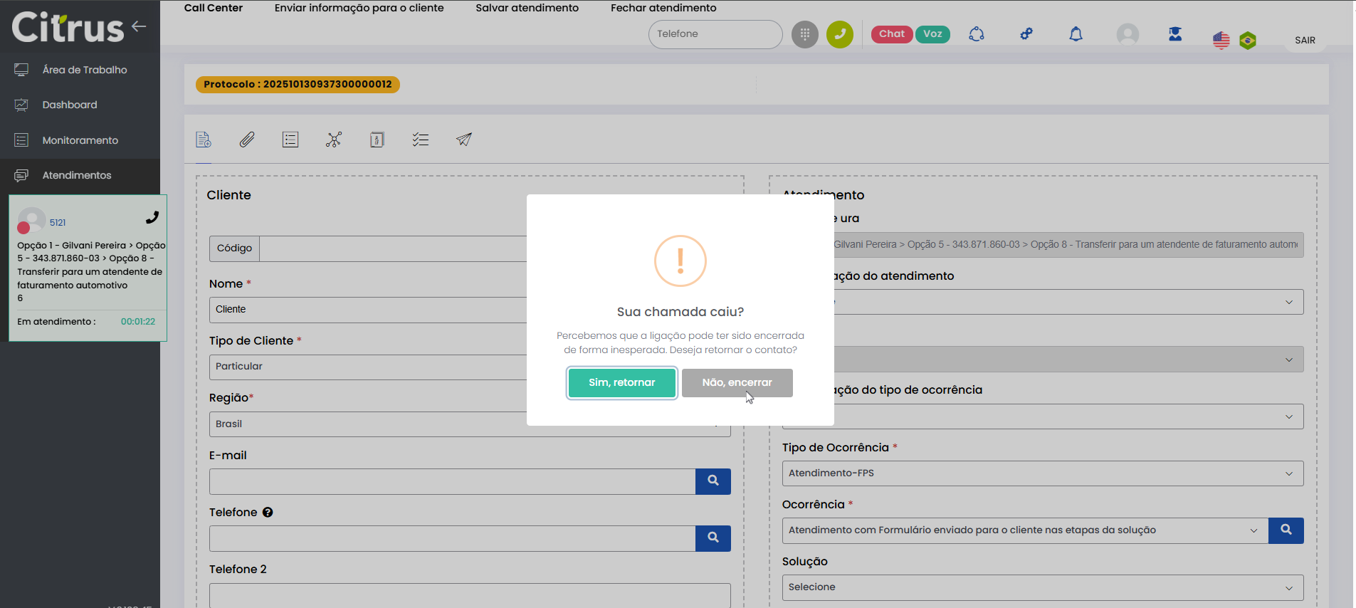 Atendimento em filas com Callback Estimated reading: 4 minutes 283 views 20/06/2025 Consulte a versão 2.109.35 O recurso de Callback (chamada de retorno) pode ser utilizado em filas do Canal de Voz para evitar o encerramento prematuro de chamadas. Ou seja, que uma ligação termine de forma não intencional. Por exemplo: queda ou desligamento pelo cliente.Quando acontece interrupção inesperada de uma chamada em andamento, ao invés de encerrar automaticamente a ligação, o sistema exibe um pop-up de decisão para o Atendente escolher entre retomar o contato ou encerrar definitivamente.A opção do Atendente fica registrada no sistema para rastreabilidade. Principais BenefíciosEvita a perda de atendimentos em andamento e reduz erros de encerramento prematuro.Controle sobre a continuidade de atendimentos, dando autonomia para o Atendente decidir retomar o atendimento.Manutenção de contexto (o atendimento retomado preserva o mesmo Protocolo).Registro da decisão do Atendente para auditoria. Pré-requisitos Para que o Callback funcione precisa ser previamente configurado nas filas de voz.Além de estar logado em fila receptiva (de entrada/inbound) para receber chamadas, o Atendente precisa estar logado em ao menos uma fila ativa (de saída, outbound), para que a chamada de retorno seja realizada. Colaborador Smartspace, consulte o Guia Sincronização de filas com Callback Ativo Realizar Atendimento com Callback O Callback inicia com a interrupção inesperada de uma chamada em andamento. Se o cliente desligar ou a chamada cair, o sistema detecta automaticamente.A partir desse momento o Atendente poderá proceder como descrito a seguir: Um pop-up é apresentado na tela de Atendimentos, exibindo o alerta: "Sua chamada caiu? Percebemos que a ligação pode ter sido encerrada de forma inesperada. Deseja retomar o contato?" O Atendente pode clicar em "Sim, retomar" ou em "Não, encerrar". IMPORTANTE IMPORTANTE Se o Atendente desligar a chamada manualmente, o pop-up não será exibido. Sim, retomar: Ao Atendente selecionar a opção de retomar o contato com o cliente, o sistema liga para o número do cliente. • Se o cliente aceitar a ligação de Callback, o atendimento será restabelecido com o mesmo número de Protocolo. • Se o cliente não aceitar a ligação de Callback, o Atendente poderá preencher as informações no formulário de atendimento (caso ainda não tenha feito) e Finalizar atendimento. Não, encerrar: Quando o Atendente clicar na opção para não fazer Callback, basta Finalizar atendimento, seguindo o procedimento padrão do sistema. O pop-up de decisão sobre Callback é exibido para o Atendente por 10 segundos. Caso nenhuma opção seja selecionada nesse tempo, o pop-up deixa de ser apresentado e, no topo do formulário do atendimento, aparecerá o botão Ligação de Callback (ícone de telefone na cor azul). O Atendente também poderá utilizá-lo para iniciar o Callback. *Mesmo que o timeout de 10 segundos do pop-up de alerta tenha expirado e o botão Ligação de Callback esteja aparecendo no topo do formulário, o Atendente ainda pode decidir não realizar o Callback. Basta selecionar o card de atendimento e executar a finalização padrão de encerramento do contato de voz. Transferência de Chamada: Se a interrupção inesperada do atendimento acontecer no processamento de transferência de chamada, Cega (Direta) ou Assistida (anunciando a transferência para o destinatário antes de concluir), a opção de retomar atendimento será mostrada para: • Atendente que iniciou a tentativa de transferência, caso a interrupção do contato aconteça antes da transferência ser concluída. • Atendente que aceitou a transferência, caso a ligação tenha sido interrompida depois do destinátário da transferência já ter aceito a chamada. Atendimento "Em espera": O comportamento do Callback será mantido, com o pop-up de alerta exibido na tela por 10 segundos e, após encerrar o tempo, o botão Ligação de Callback (ícone de telefone na cor azul) aparecendo no topo do formulário de atendimento. Múltiplos cards em atendimento: Quando vários cards de voz estiverem em atendimento, basta o Atendente clicar naquele que teve a ligação interrompida e para o qual deseja realizar Callback. Consulte a Release notes da Versão 2.109.35 × Clique nas imagens para vê-las em tela cheia.Se preferir, recolha o menu da lateral esquerda da página para uma melhor visualização de imagens e vídeos. Tagged:Agente com CallbackAtendente com CallbackAtendimento Canal de Voz com CallbackAtendimento de Voz com CallbackAtendimento de Voz em Filas com CallbackAtendimento em Filas com CallbackAtrendimento de Voz com CallbackCall Center com CallbackCallback na Tela de AtendimentosCanal de Voz com CallbackComo fazer Chamada CallbackComo Fazer Ligação CallbackComo Retornar Chamada com ClienteContact Center com CallbackFilas de Voz com CallbackOperador com CallbackTela de Atendimentos com Callback