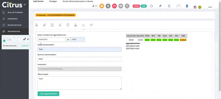 Callback Agendado Estimated reading: 5 minutes 396 views O recurso de Callback Agendado, disponível para Atendentes por meio da integração com a solução de Voz, permite definir como será realizado o retorno agendado de chamadas (callback) para clientes que contatarem o canal de atendimento de Voz e solicitarem uma chamada de retorno após uma ligação atendida.A partir disso, o Atendente poderá agendar uma ligação futura para o cliente que solicitou chamada de retorno, determinando previamente os critérios que serão adotados. Dessa forma, nos atendimentos, após recepcionar uma chamada, o Atendente poderá agendar chamadas de retorno para um horário e/ou data que sejam mais convenientes para o cliente.Essa funcionalidade contribui para uma atuação mais eficaz de empresas que são regidas pela Lei do SAC (Decreto nº 11.034, de 5 de abril de 2022), que regulamenta o Código de Defesa do Consumidor para estabelecer diretrizes e normas sobre o Serviço de Atendimento ao Consumidor e prevê, dentre outras coisas, a necessidade da pluralidade de canais e o retorno das chamadas cujas solicitações ainda não tenham sido concluídas. Pré-requisitos Para utilizar a funcionalidade Callback Agendado, é necessário atender aos seguintes critérios:Ter usuário com Perfil de Atendente;Apresentar Configurações de integração com o UNITY (Administração > Configurações Gerais > Integração com o UNITY) predefinidas na plataforma Citrus.cx;Possuir um usuário da solução de Voz associado ao usuário Atendente doCitrus.cx (Administração > Usuários > Associação com usuário do Unity);Na plataforma da solução de Voz, ter as permissões de Callback Agendado concedidas ao usuário associado do Unity (Atendente/Agente) por um usuário Administrador por meio do menu Configurações > Perfis > (perfil) Agente > (aba) Metrics. Permissões Para ser acessada pelo Atendente no Citrus.cx, a funcionalidade de Callback Agendado precisa ser habilitada para o seu usuário associado na plataforma da solução de Voz (Unity) por um outro usuário com permissão para editar Perfis, como um Administrador.Para conceder permissões de uso da funcionalidade, é necessário acessar Configurações > Perfis > (aba) Metrics. Para que o usuário associado do Unity tenha acesso ao recurso, deverão ser, obrigatoriamente, habilitadas as seguintes opções:Visualizar agendamentos de callbackCriar agendamentos de callbackEditar agendamentos de callbackCancelar agendamentos de callbackCaso essas permissões estejam desabilitadas, o Atendente do Citrus.cx não visualizará a aba “Agendamento de Callback” na tela de registro de Atendimentos, não podendo executar nenhuma tarefa relacionada a esse recurso. DICA Após habilitadas as permissões, pode ser necessário realizar logout e novo login no sistema para que seja possível acessar o recurso. Ações do Atendente O Atendente pode agendar chamadas de retorno (Callback Agendado) para realizar nova(s) tentativa(s) de atendimento para clientes que não puderam atender ligação ou solicitaram contato futuro.Exemplo de utilização: Na rotina de serviços de atendimento, é comum que o Atendente ligue para uma pessoa e ela afirme não estar disponível para falar naquele momento. Nesses casos, ele poderá questionar qual seria o melhor horário para retornar o contato e utilizar o recurso de Callback Agendado para agendar essa chamada de retorno. Criar Agendamento de Callback O agendamento de ligações de retorno poderá ser realizado pelo Atendente por meio do formulário de “Agendamento de Callback”, na aba de registro de Atendimentos associada ao menu LemonDesk > Atendimentos.Estando logado em uma fila de Voz, ao aceitar um card de atendimento, a tela de registro de Atendimentos será aberta automaticamente e o Atendente poderá clicar no ícone da aba “Agendamento de Callback”, na qual será exibido o formulário para cadastro de uma chamada de retorno agendada. Nele, o Atendente poderá visualizar as escalas de atendimento para Callback Agendado (configuradas na plataforma Unity) e verificar se já existem agendamentos cadastrados para o número de telefone ou ramal que originou a chamada. Para agendar uma chamada de retorno, o Atendente deverá, observando os horários de atividade nas escalas de atendimento, preencher os seguintes campos obrigatórios:Data e horário do agendamento: Dia e hora exata em que a chamada de retorno será realizada, selecionados a partir da data vigente (nos formatos DD/MM/AAAA e HH:MM).Nome (do) destinatário: Nome da pessoa para quem será realizada a chamada de retorno.Número (do) destinatário: Telefone ou ramal para o qual será feita a chamada de retorno.Protocolo: Protocolo do atendimento que gerou a solicitação de chamada de retorno (preenchido automaticamente pela plataforma).Após inserir todas as informações necessárias no formulário, basta pressionar o botão Criar agendamento na parte inferior da tela para que os dados sejam registrados e a ligação de retorno na data e no horário definidos seja agendada. DICA O campo “Observação” é de preenchimento opcional. Nele, o Atendente poderá anotar informações adicionais sobre a ligação de retorno que está sendo agendada. IMPORTANTE O uso da funcionalidade de Callback Agendado é viabilizado por meio da integração com a plataforma de Voz (Unity). Portanto, as configurações desse recurso, incluindo parâmetros como dias de realização das chamadas, horários de início e de fim, número máximo de tentativas e tempo entre as tentativas, só poderão ser definidas e/ou alteradas por um usuário Administrador no Unity. Tabela de Versionamento Versão Última Atualização 2.79.0 31/07/2023 Tagged:AgenteAgentesAtendenteAtendentesAtendimentoAtendimentosCallback AgendadoCitrusLemonDeskUnityVoz