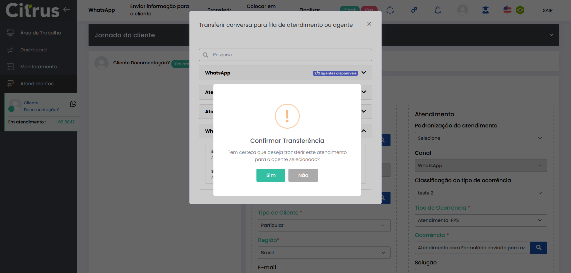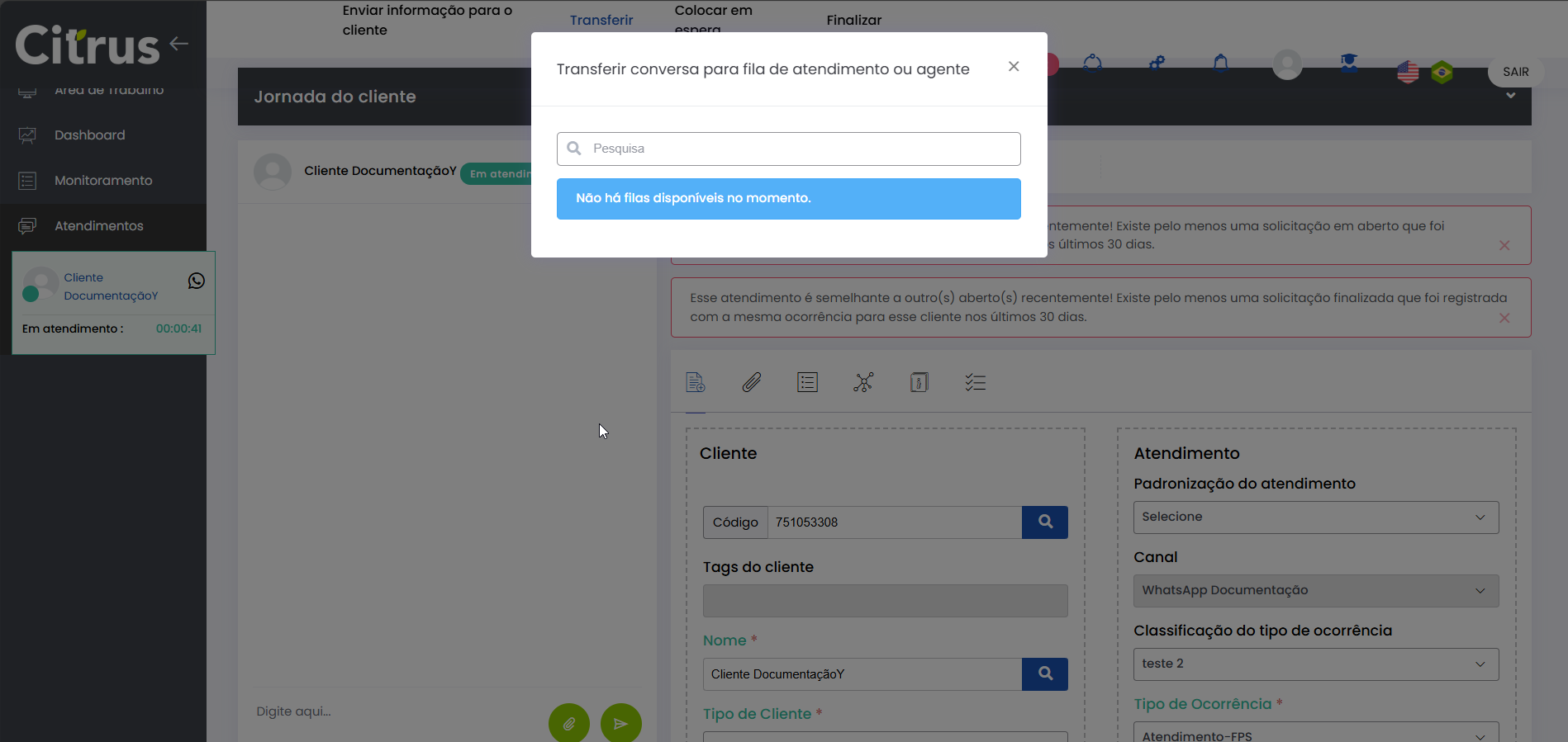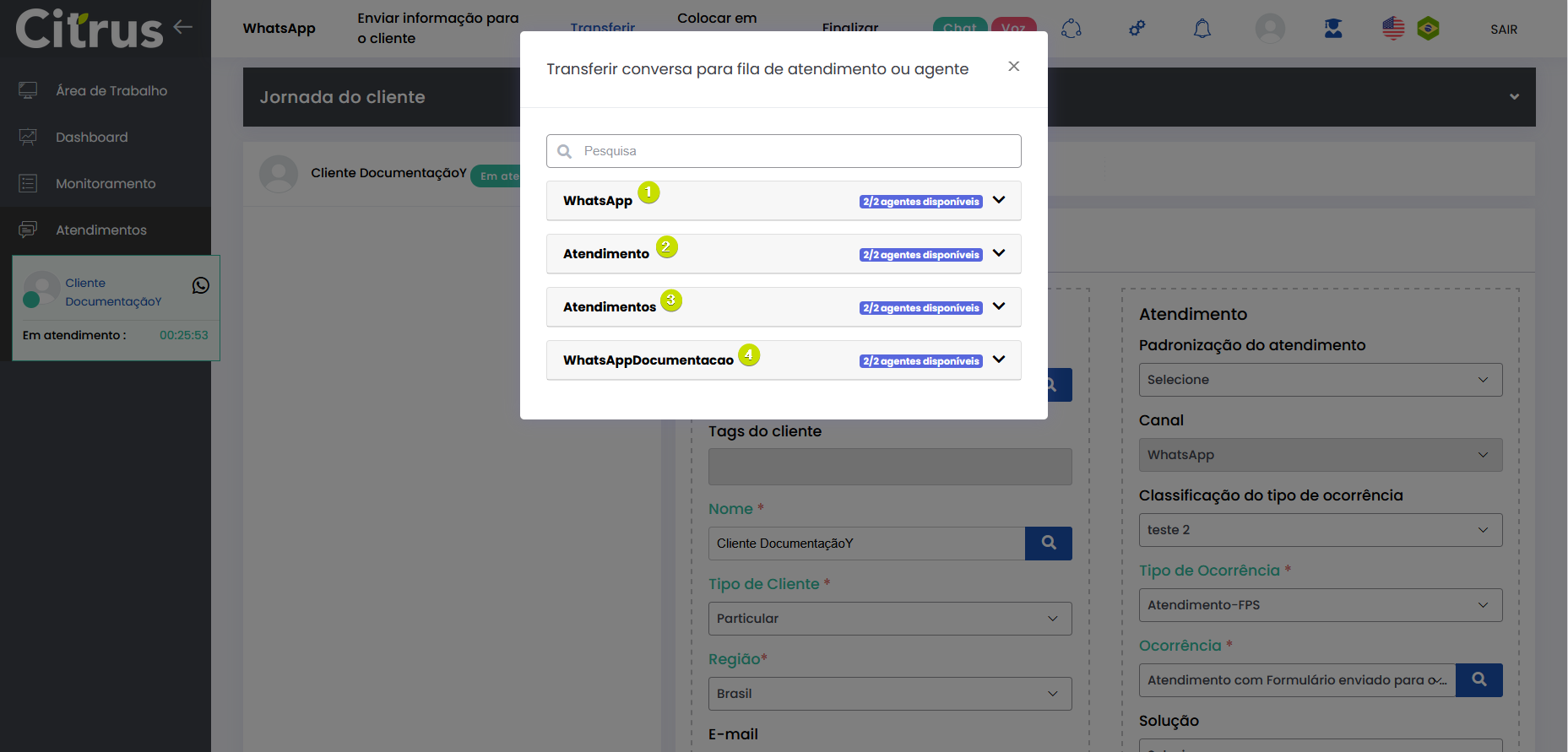 Transferir Atendimento WhatsApp Estimated reading: 4 minutes 247 views 04/08/2025 Consulte a versão 2.109.37 O Atendente pode transferir atendimentos em andamento para outra fila ou outro Atendente do canal WhatsApp.O recurso evita que o cliente precise reiniciar a conversa ou repetir informações, já que é direcionado automaticamente para o setor ou Atendente mais adequado. BenefíciosO cliente não precisa repetir informações após a transferência.O novo Atendente tem acesso a todo o histórico da conversa.O atendimento segue com o mesmo número de Protocolo.Apenas Atendentes realmente disponíveis recebem a transferência.A experiência do cliente permanece fluida e transparente. Como a transferência funciona O atendimento permanece no canal: transferência só pode ser feita WhatsApp → WhatsApp.Campos obrigatórios do formulário de atendimento devem estar preenchidos antes da transferência.O atendimento transferido entra na fila de destino como prioridade 1, sendo o próximo a ser ofertado.O card é transferido respeitando o limite de atendimentos simultâneos por Atendente.Atendentes que atingiram o número máximo de atendimentos simultâneos estarão desabilitados para seleção no momento da transferência.Entre os Atendentes, a distribuição do atendimento respeitará a ordem da menor para a maior carga de atendimentos. Consulte Regras para Oferta de Cards de WhatsApp e WebChat Como transferir atendimento no canal WhatsApp Após preencher os campos obrigatórios do formulário do atendimento, clique no botão Transferir (topo do formulário). * Caso o Atendente não tenha preenchido todos os campos obrigatórios do formulário do atendimento, será alertado e não poderá seguir com a transferência. Se os dados obrigatórios foram adicionados ao formulário, ao pressionar Transferir o Atendente verá o pop-up de transferência na tela de Atendimentos. Ele pode aparecer de duas formas, contemplando os cenários possíveis sobre transferência: 1. Quando não existem filas disponíveis para receber transferência de atendimento 2. Quando existem filas disponíveis para receber transferência de atendimento Selecionar fila de atendimento ou Atendente: No pop-up de "Transferir conversa para fila de atendimento ou agente", serão listadas as filas do canal WhatsApp. Ao lado de cada fila aparecem o total de Atendentes logados (na fila) e quantos desses encontram-se "disponíveis" para receber oferta de card de atendimento. Observe que existem quatro filas, cada uma com 2 Atendentes logados e todos "disponíveis" para receber a transferência de atendimento. Ao clicar no seletor para ver mais informações de uma fila, será possível conferir quantos atendimentos "ativos" ou "em oferta" encontram-se com cada Atendente. Basta clicar no nome do Atendente para quem deseja transferir. Um novo pop-up solicitará confirmação da transferência para o Atendente selecionado. Pressione Sim, para confirmar. Ou, Não, para cancelar. O card será ofertado para o Atendente selecionado como destinatário da transferência. Quando o Atendente Aceitar o card, visualizará: 1. O número de Protocolo original do atendimento. 2. Todas as informações inseridas no formulário pelo(s) Atendente(s) que já conversaram com o cliente. 3. Todo histórico de conversas (chat) com o cliente. O Atendente poderá prosseguir a conversa com o cliente e optar por realizar nova transferência ou Finalizar o atendimento. Acesse a Release notes da versão 2.109.37. Consulte também o Guia de Transferência de Atendimento no WebChat. Quer saber como os atendimentos são mostrados em tempo real para o Supervisor?Acesse o Guia de Monitoramento Citrus. × Clique nas imagens desta página para vê-las em tela cheia. Se preferir, recolha o menu da lateral esquerda da página para uma melhor visualização. Tagged:Agente Suporte WhatsAppAtendimento ao Cliente WhatsAppAtendimento Contact CenterCall CenterCall Center OmnichannelChat Atendimento WhatsAppContact CenterContact Center CitrusContact Center com WhatsAppContact Center OmnichannelPlataforma Atendimento WhatsAppRecurso Transferir AtendimentoSuporte Atendimento DigitalSuporte Online WhatsAppTransferência Atendimento ClienteTransferência de Atendimento OnlineTransferência de Atendimento WhatsAppTransferência de Atendimento WhatsApp de FilaTransferência de Card WhatsAppTransferência de Cliente de FilaTransferência de Conversa WhatsAppTransferirTransferir AtendimentoTransferir Atendimento de WhatsAppTransferir Atendimento WhatsAppTransferir AtendimentosTransferir Card de WhatsAppTransferir cliente de filaTransferir Cliente de Fila de AtendimentoTransferir WhatsAppTransferir WhatsApp para Outro AtendenteWhatsApp Atendimento Omnichannel