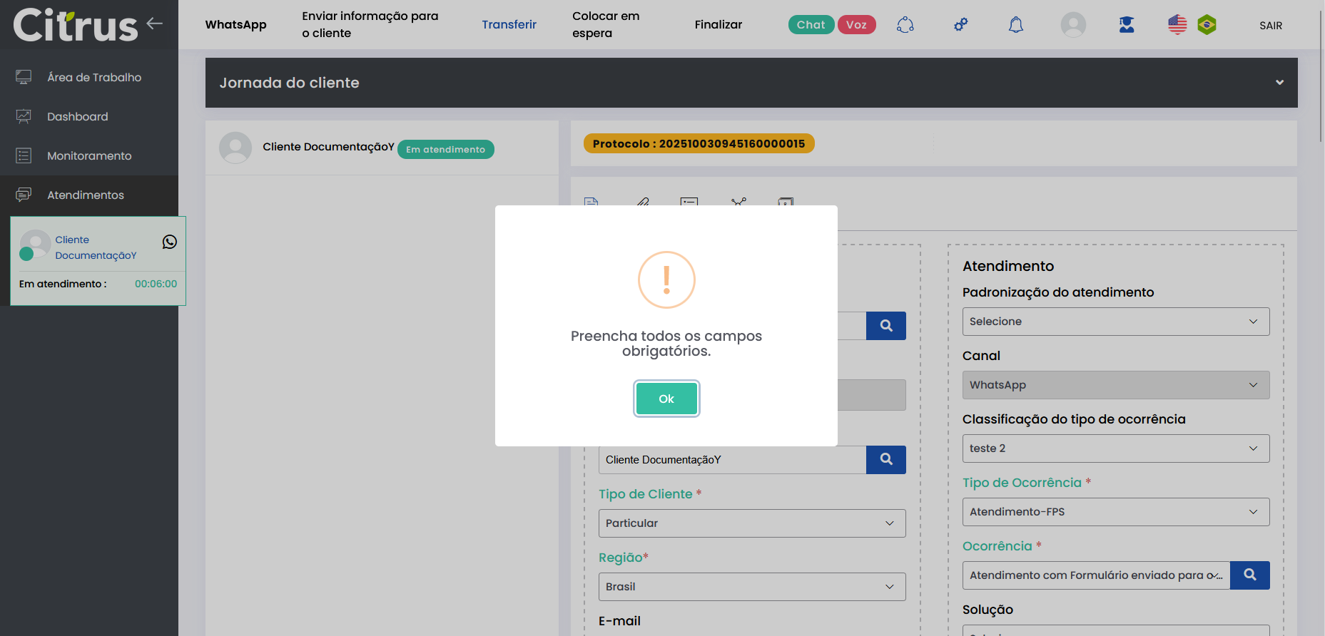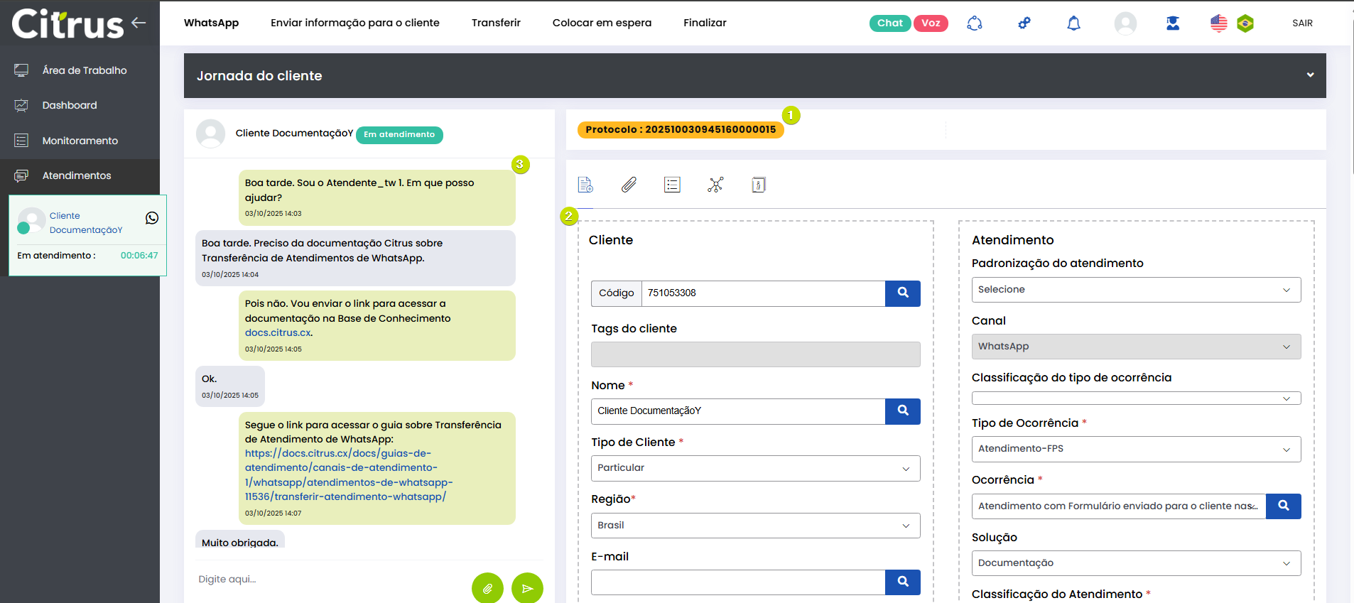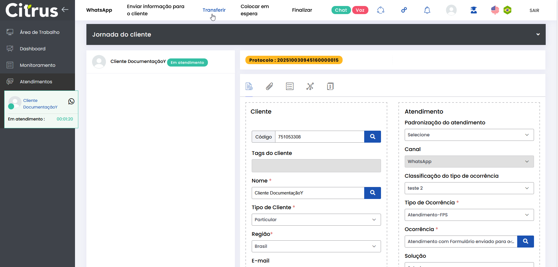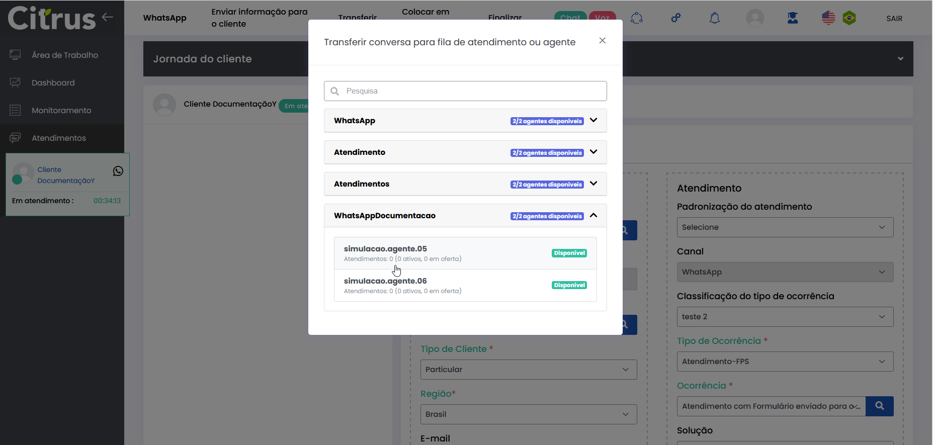 Transferir Atendimento WhatsApp Estimated reading: 4 minutes 247 views 04/08/2025 Consulte a versão 2.109.37 O Atendente pode transferir atendimentos em andamento para outra fila ou outro Atendente do canal WhatsApp.O recurso evita que o cliente precise reiniciar a conversa ou repetir informações, já que é direcionado automaticamente para o setor ou Atendente mais adequado. BenefíciosO cliente não precisa repetir informações após a transferência.O novo Atendente tem acesso a todo o histórico da conversa.O atendimento segue com o mesmo número de Protocolo.Apenas Atendentes realmente disponíveis recebem a transferência.A experiência do cliente permanece fluida e transparente. Como a transferência funciona O atendimento permanece no canal: transferência só pode ser feita WhatsApp → WhatsApp.Campos obrigatórios do formulário de atendimento devem estar preenchidos antes da transferência.O atendimento transferido entra na fila de destino como prioridade 1, sendo o próximo a ser ofertado.O card é transferido respeitando o limite de atendimentos simultâneos por Atendente.Atendentes que atingiram o número máximo de atendimentos simultâneos estarão desabilitados para seleção no momento da transferência.Entre os Atendentes, a distribuição do atendimento respeitará a ordem da menor para a maior carga de atendimentos. Consulte Regras para Oferta de Cards de WhatsApp e WebChat Como transferir atendimento no canal WhatsApp Após preencher os campos obrigatórios do formulário do atendimento, clique no botão Transferir (topo do formulário). * Caso o Atendente não tenha preenchido todos os campos obrigatórios do formulário do atendimento, será alertado e não poderá seguir com a transferência. Se os dados obrigatórios foram adicionados ao formulário, ao pressionar Transferir o Atendente verá o pop-up de transferência na tela de Atendimentos. Ele pode aparecer de duas formas, contemplando os cenários possíveis sobre transferência: 1. Quando não existem filas disponíveis para receber transferência de atendimento 2. Quando existem filas disponíveis para receber transferência de atendimento Selecionar fila de atendimento ou Atendente: No pop-up de "Transferir conversa para fila de atendimento ou agente", serão listadas as filas do canal WhatsApp. Ao lado de cada fila aparecem o total de Atendentes logados (na fila) e quantos desses encontram-se "disponíveis" para receber oferta de card de atendimento. Observe que existem quatro filas, cada uma com 2 Atendentes logados e todos "disponíveis" para receber a transferência de atendimento. Ao clicar no seletor para ver mais informações de uma fila, será possível conferir quantos atendimentos "ativos" ou "em oferta" encontram-se com cada Atendente. Basta clicar no nome do Atendente para quem deseja transferir. Um novo pop-up solicitará confirmação da transferência para o Atendente selecionado. Pressione Sim, para confirmar. Ou, Não, para cancelar. O card será ofertado para o Atendente selecionado como destinatário da transferência. Quando o Atendente Aceitar o card, visualizará: 1. O número de Protocolo original do atendimento. 2. Todas as informações inseridas no formulário pelo(s) Atendente(s) que já conversaram com o cliente. 3. Todo histórico de conversas (chat) com o cliente. O Atendente poderá prosseguir a conversa com o cliente e optar por realizar nova transferência ou Finalizar o atendimento. Acesse a Release notes da versão 2.109.37. Consulte também o Guia de Transferência de Atendimento no WebChat. Quer saber como os atendimentos são mostrados em tempo real para o Supervisor?Acesse o Guia de Monitoramento Citrus. × Clique nas imagens desta página para vê-las em tela cheia. Se preferir, recolha o menu da lateral esquerda da página para uma melhor visualização. Tagged:Agente Suporte WhatsAppAtendimento ao Cliente WhatsAppAtendimento Contact CenterCall CenterCall Center OmnichannelChat Atendimento WhatsAppContact CenterContact Center CitrusContact Center com WhatsAppContact Center OmnichannelPlataforma Atendimento WhatsAppRecurso Transferir AtendimentoSuporte Atendimento DigitalSuporte Online WhatsAppTransferência Atendimento ClienteTransferência de Atendimento OnlineTransferência de Atendimento WhatsAppTransferência de Atendimento WhatsApp de FilaTransferência de Card WhatsAppTransferência de Cliente de FilaTransferência de Conversa WhatsAppTransferirTransferir AtendimentoTransferir Atendimento de WhatsAppTransferir Atendimento WhatsAppTransferir AtendimentosTransferir Card de WhatsAppTransferir cliente de filaTransferir Cliente de Fila de AtendimentoTransferir WhatsAppTransferir WhatsApp para Outro AtendenteWhatsApp Atendimento Omnichannel