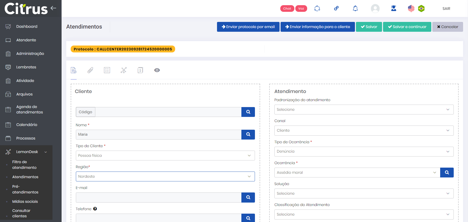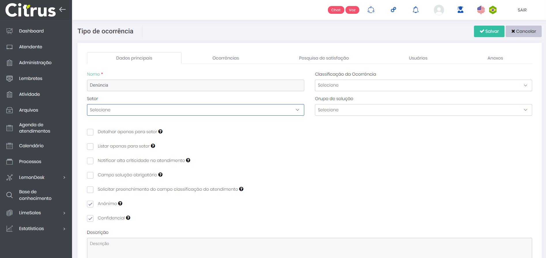 Atendimentos Anônimos e Confidenciais Estimated reading: 4 minutes 585 views No Citrus.cx, a funcionalidade de Atendimentos Anônimos e Confidenciais, permite a criação de registros de atendimentos classificados como anônimos e/ou confidenciais, cujo conteúdo poderá ser restringido, sendo ocultado integralmente ou em parte para usuários que não possuírem as permissões de acesso necessárias.Atendimentos classificados como Anônimos são aqueles nos quais as informações do cliente não ficam visíveis para os usuários em geral. Já nos Confidenciais todas as informações relativas aos atendimentos ficam ocultas. Em ambos os casos, apenas os usuários com as respectivas permissões necessárias para visualizar esse tipo de conteúdo poderão acessá-los.A funcionalidade contribui para a efetividade de ações de compliance, garantindo o anonimato e a confidencialidade das informações em determinadas ocorrências, a exemplo de casos de denúncia de assédio no ambiente organizacional. Permissões Para que possa visualizar as informações contidas em registros de atendimentos anônimos e confidenciais, o usuário deverá possuir as seguintes permissões habilitadas para o seu respectivo Perfil (menu Administração > Usuários > Perfil > (selecionar Perfil) > (aba) LemonDesk): Visualizar atendimento anônimoVisualizar atendimento confidencial Criar Tipo de ocorrência para Atendimento Anônimo e/ou Confidencial Primeiramente, para que um atendimento possa ser classificado como anônimo e/ou confidencial, é necessário que seja criado um Tipo de Ocorrência com essas características. Para isso, um usuário com Perfil de Administrador deverá: 1. Acessar a tela de cadastro de Tipo de ocorrência (menu Administração > Configurações Gerais > Tipo de ocorrência > +Novo).2. Preencher os campos necessários.3. Marcar a(s) flag(s):Anônimo: Habilite essa opção para ocultar as informações do Cliente ao selecionar, no formulário de registro de um atendimento, o Tipo de ocorrência que está sendo configurado. Confidencial: Habilite essa opção para ocultar as informações do Atendimento ao selecionar, no formulário de seu registro de atendimento, o Tipo de ocorrência que está sendo configurado. 4. Clicar no botão Salvar e continuar.5. Na tela seguinte, inserir outras informações necessárias e clicar em Salvar. Criar Atendimento Anônimo e/ou Confidencial Havendo Tipo de ocorrência cadastrado e habilitado com as opções “Anônimo” e/ou “Confidencial”, na tela do formulário de registro de atendimento, o Atendente deverá:1. Na aba “Atendimento”, preencher os campos obrigatórios e campos de preenchimento opcional do “Cliente” que forem necessários.2. Nos campos relativos ao “Atendimento”, em “Tipo de Ocorrência”, selecionar um Tipo de ocorrência que tenha sido configurado com as flags de “Anônimo” e/ou “Confidencial”.3. No campo “Ocorrência”, selecionar a Ocorrência que melhor se adeque ao caso.4. Preencher os demais campos obrigatórios e clicar em Salvar e continuar.5. Adicionadas outras informações ou arquivos necessários, basta clicar em Salvar para que o atendimento seja registrado. *Para facilitar o registro das informações e o preenchimento dos campos “Código”, “Nome” e “Tipo de Cliente” no caso dos atendimentos anônimos, é recomendável que sejam criados na plataforma um Tipo de Cliente (menu Administração > Configurações Gerais > Tipo de cliente) e um Cliente (menu Administração > Configurações Gerais > Cliente) específicos para esse cenário (ex.: Anônimo; Desconhecido; Não Identificado), associados a um Código de fácil memorização (ex.: 0000). Na tela de listagem de Atendimentos (LemonDesk > Atendimentos), o usuário que possuir permissão para visualizar atendimentos anônimos conseguirá vê-los normalmente, conforme representado abaixo: Contudo, os usuários que não possuírem a permissão para “Visualizar atendimento anônimo” habilitada não conseguirão visualizar as informações relativas ao Cliente e o protocolo será exibido da seguinte maneira: No caso dos atendimentos confidenciais, usuários com permissão para “Visualizar atendimento confidencial”, conseguirão vê-los sem nenhum impedimento na tela de listagem: Usuários sem permissão, por outro lado, verão o mesmo protocolo de atendimento na tela de listagem da seguinte forma, não podendo sequer acessar a sua tela de cadastro: Tabela de Versionamento Versão Última Atualização 2.84.0 25/09/2023 Tagged:AgenteAgentesAnônimoAnônimosAtendenteAtendentesAtendimentoAtendimentosCitrusConfidenciaisConfidencialLemonDesk