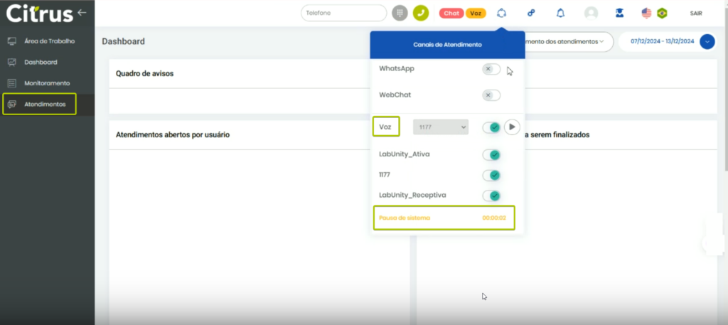 Versão 2.109.11 Estimated reading: 2 minutes 223 views 13/12/2024 NOVIDADE Administração | Atendimentos: Tela de Atendimentos poderá exibir “Pausa de sistema” Quando uma fila de atendimento do Canal de Voz possuir configuração de número máximo de tentativas de chamadas sem resposta (Max no Answer), e esse limite for atingido, o motivo automático de pausa nomeado de “Pausa de Sistema” será exibido na listagem de Canais de Atendimento (menu Atendente > Atendimentos). Para sair da “Pausa de Sistema” o Atendente precisa clicar no ícone de play ao lado do número do Ramal da fila de atendimento pelo Canal de Voz. Uma vez configurada como Motivo na plataforma Citrus (Administração > Configurações Gerais > Motivo > Motivos > +Novo), a “Pausa de sistema” não poderá ser editada ou excluída. O recurso Max no Answer determina depois de quantas ligações não atendidas um Ramal/fila será automaticamente colocada em pausa. O motivo será apresentado de forma automática na tela de Atendimentos da solução Citrus, sempre que for identificado que um Ramal/fila se encontra em status de pausa, sem motivo. Clique na galeria para ver as imagens em tela cheia. Tagged:AdministraçãoAtendenteAtendimento Canal de VozAtendimentosCanal de VozCitrus 2.109.11Citrus Versão 2.109.11Configurações GeraisFila de atendimentoFila RamalÍcone de PlayLimite de TentativasMax No AnswerMotivoMotivo Automático de PausaMotivo de pausaPausa Automática de SistemaPausa de sistemaPausa do AtendentePausa do AtendimentoPausa do RamalPausa no AtendimentoPausa no Canal de VozPausa no RamalPlay Sair de PausaRamalRamal do Canal de VozRamal Sem AtenderRelease notesRelease Notes CitrusSair de PausaStatus Canal de VozStatus de PausaStatus Fila de VozTela de AtendimentosTempo Sem RespostaVersão 2.109.11