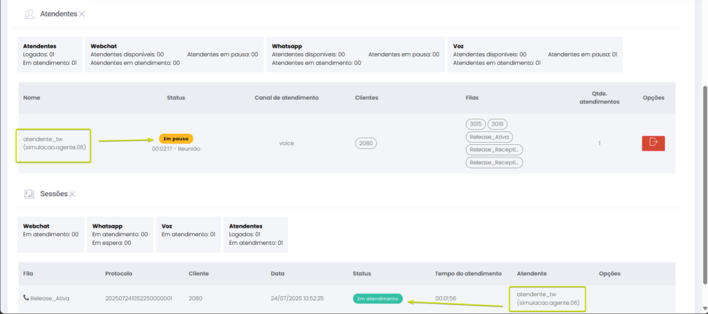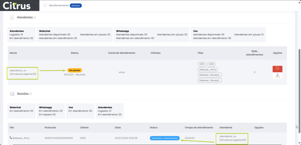 Versão 2.109.16 Estimated reading: 2 minutes 143 views 04/01/2025 NOVIDADE Atendimentos: Atendente em Pausa poderá fazer chamada ativa Agora, o Atendente pode fazer chamada ativa mesmo estando em Pausa, sem que seu status de atendimento seja alterado.Enquanto estiver realizando a chamada ativa estando com status Pausa, a saída da Pausa será bloqueada. A liberação para sair da Pausa ocorrerá ao finalizar a chamada. Nas seções da tela de Monitoramento, o Supervisor visualizará as seguintes informações: Atendentes: A coluna “Status” mostrará que o Atendente está Em pausa. Sessões: Exibirá o Atendente em chamada com “Status” Em atendimento e, a seguir, Salvando o atendimento. Confira todos os detalhes no Guia de Monitoramento MELHORIA Administração: Bloqueada a edição de Atendentes logados em canais de chat A edição do cadastro de usuário de Atendentes não poderá ser feita enquanto ele estiver logado em filas de chat, como WebChat e WhastApp.Quando uma tentativa de edição for realizada pelo menu Administração > Usuários > Usuário > (editar cadastro de usuário), uma notificação será exibida para alertar que não é possível atualizar o cadastro sem antes solicitar que o Atendente faça logout das filas. Confira novas melhorias aplicadas na Release notes das versão 2.109.23. CORREÇÕES Atendimentos | Monitoramento: Resolvida falha de registro de chamada de voz Chamadas que tocarem em fila de voz quando nenhum Atendente estiver logado para atender serão devidamente registradas como não atendidas, assegurando a consistência dos dados exibidos para o Supervisor na tela de Monitoramento. Monitoramento: Ajustada a sincronia de status de Atendentes O status do Atendente na tela de Atendimentos está sendo corretamente atualizado na tela de Monitoramento, para que o Supervisor acompanhe a situação de Grupos de monitoramento. Tagged:AtendenteAtendente Em PausaAtendimentosCanaisCanais de AtendimentoCanais de ChatChamada AivaChamada AtivaChamada Ativa em PausaChamada Ava Em PausaChamada com Atendente em PausaEditar AtendentesEm PausaFazer Chamada com Atendente em PausaFila de VozGrupo de monitoramentoLogout do AtendenteMonitoramento Canais de AtendimentoMonitorar Canais de AtendimentoNotas de VersãoNotas de Versão CitrusPausaPausa do AtendenteRelease notesStatus de AtendimentosStatus do AtendenteSupervisorSupervisor Call CenterSupervisor Contact CenterSupervisor Grupo de Monitoramento de Call CenterTela de MonitoramentoVersão 2.109.16WebChatWebChat e WhatsAppWhatsApp