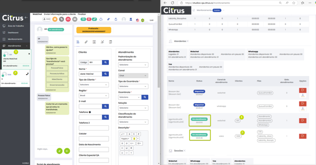 Versão 2.109.18 Estimated reading: 2 minutes 102 views 17/01/2025 CORREÇÕES Monitoramento: Contador de tempo exibirá o atendimento em que o Atendente se encontra há mais tempo, para cada canal O contador de tempo de atendimentos da seção Atendentes (tela de Monitoramento > (aba) Detalhes) exibirá, para cada canal em que um Atendente está “Em atendimento”, o tempo do card que apresenta maior duração.O padrão evita que sejam exibidos tempos iguais para atendimentos de canais diferentes, permitindo que o Supervisor tenha uma visão real do tempo dedicado a cada atendimento. No exemplo é possível comparar em tempo real os atendimentos de um Atendente, na tela de Atendimentos, e as informações apresentadas para o Supervisor na tela de Monitoramento . Monitoramento: Atendimentos abandonados por Atendentes passam a ser contabilizados na aba Resumo Quando um Atendente receber um card ofertado a ele na tela de Atendimentos e abandonar esse atendimento, por exemplo, fazendo logout da fila, esse atendimento será considerado nas “Estatísticas resumidas das filas”, na contagem de Atendidas.Assim, não devem ocorrer divergências entre os dados exibidos para o Supervisor na aba Resumo > (seção) Estatísticas resumidas das filas e os registrados em Banco de Dados. Consulte o Guia de Monitoramento Citrus Tagged:Aba Detalhes do MonitoramentoAba Detalhes MonitoramentoAba Resumo do MonitoramentoAtendentesEm AtendimentoGuia de MonitoramentoMonitoramentoMonitoramento Call CenterMonitorar AtendimentosMonitorar Atendimentos de Call CenterNotas de VersãoNotas de Versão CitrusRelease notesStatus de AtendimentosStatus Em atendimento no MonitoramentoSupervisorTela de MonitoramentoTela de Monitoramento CitrusTempo do atendimentoVersão 2.109.18