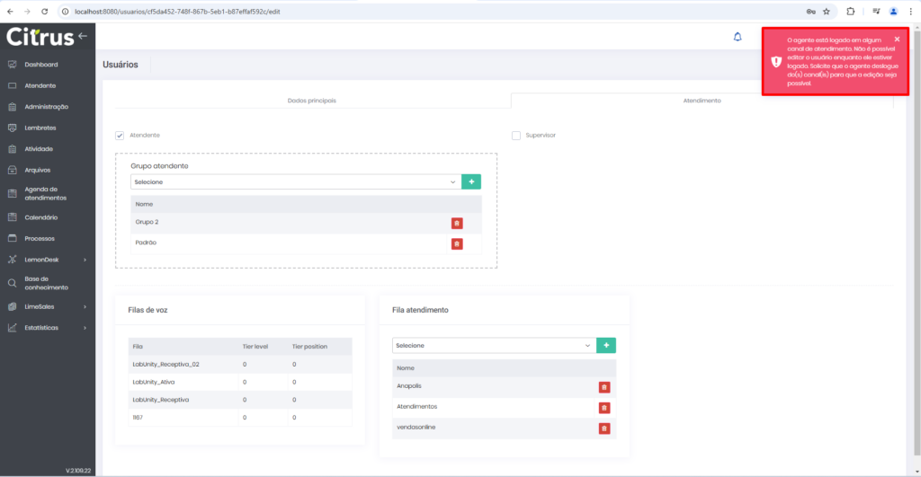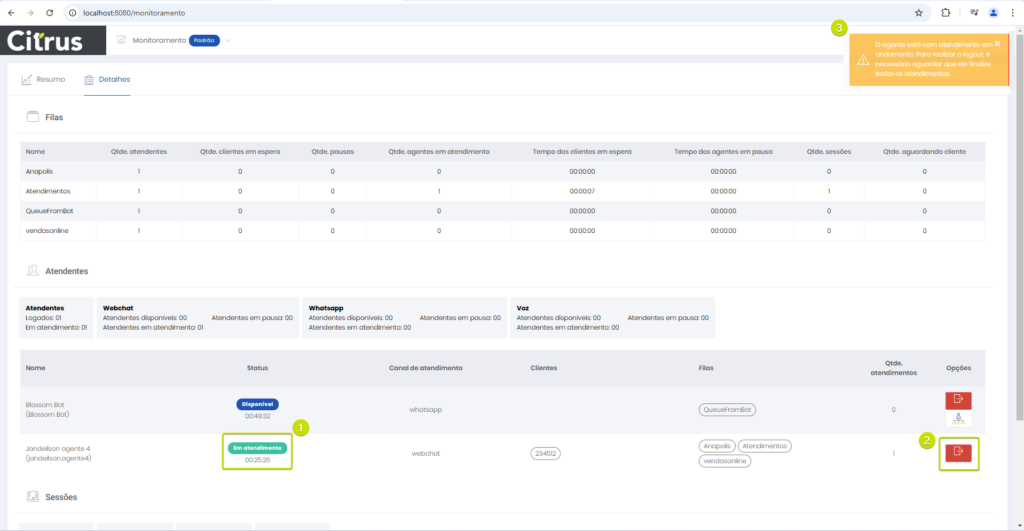 Versão 2.109.23 Estimated reading: 1 minute 103 views 07/02/2025 MELHORIAS Atendimentos: Aplicado ajuste em alerta exibido ao tentar editar cadastro de Atendente que está logado em filas de chat Agora o texto do alerta informa que o Atendente “está logado em algum canal de atendimento”. A melhoria evita que o alerta específico sobre login em canais de chat (WebChat e WhastApp) seja exibido mesmo quando o Atendente não está logado em filas de chat, mas está logado em filas de voz. Consulte informações sobre o bloqueio de edição de cadastro de Atendente logado em canais de chat nas Release notes da versãos 2.109.16. Monitoramento: Supervisor não poderá deslogar Atendente de filas enquanto estiver em atendimento Adicionado alerta na tela de Monitoramento para notificar Supervisor que não é possível aplicar a ação Logout do agente de filas de voz e de chat (WhatsApp e WebChat), enquanto atendimentos estiverem acontecendo. Confira essa e outras regras de negócio no Guia de Monitoramento Tagged:Aba DetalhesAções do SupervisorAtendenteAtendimentosCanal WebChatCanal WhatsAppGuia de MonitoramentoRelease notesSupervisorVersão 2.109.23