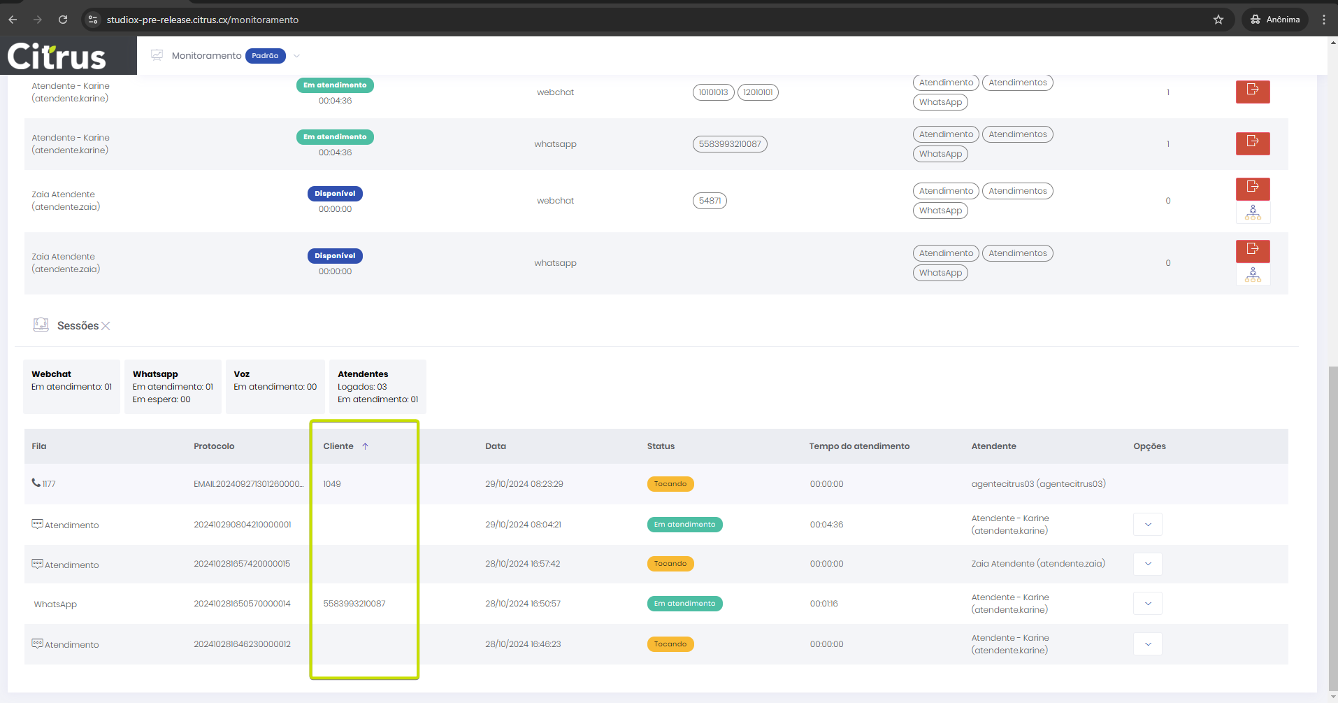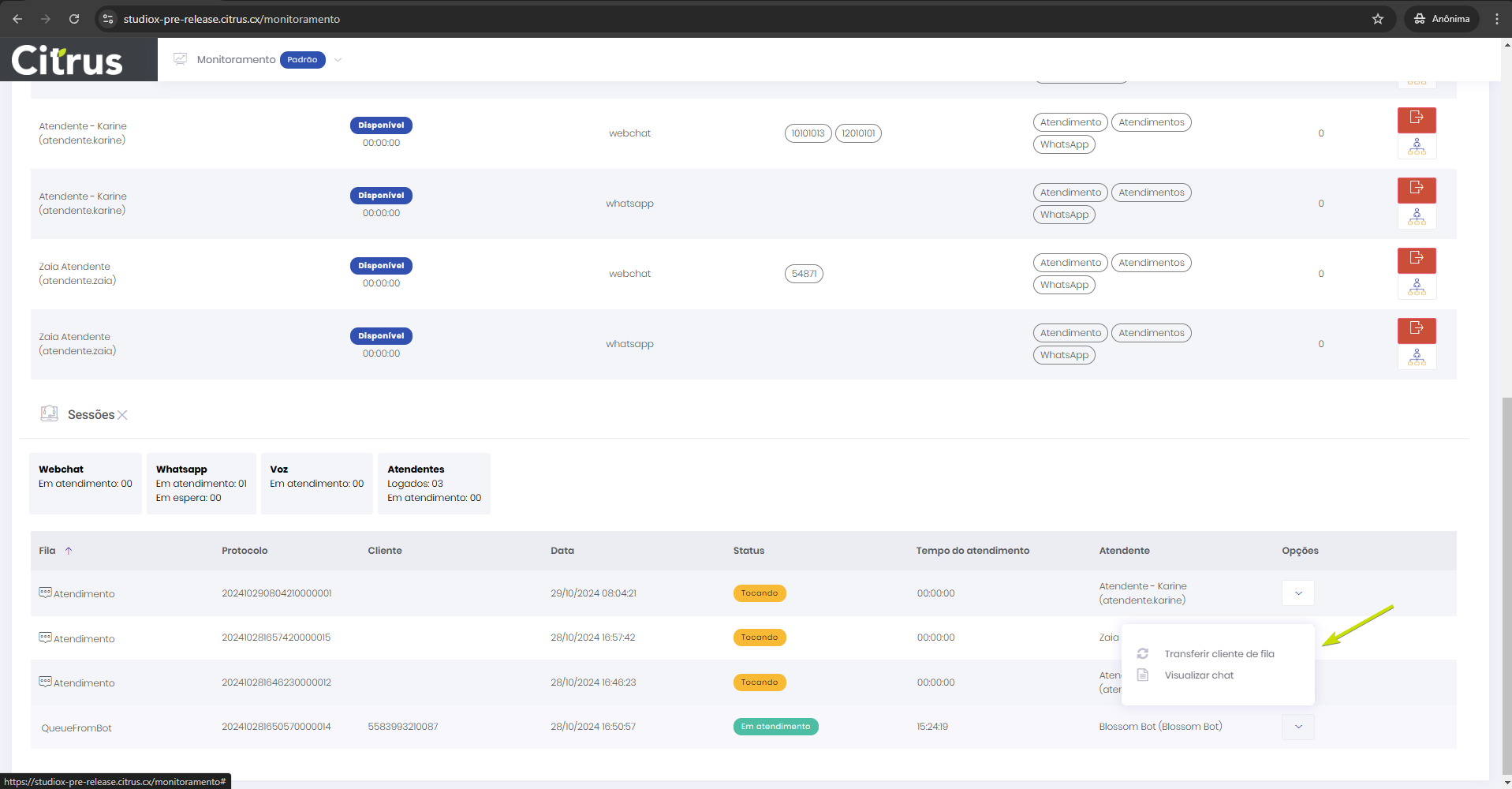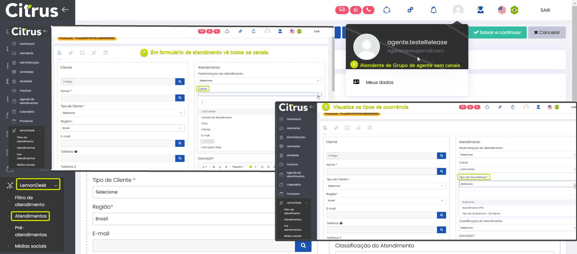 Versão 2.111.0 Estimated reading: 6 minutes 355 views 28/10/2024 NOVIDADE Monitoramento: Aplicadas atualizações de usabilidade para melhorar a experiência de usuário A interface da aba Detalhes da tela de Monitoramento (Estatísticas > Monitoramento > (aba) Detalhes) recebeu novos recursos de usabilidade.As melhorias devem otimizar a visualização de informações e mantê-las organizadas mesmo se a tela for atualizada. Enquanto monitora atendimentos, o Supervisor poderá recolher e expandir Dados de Filas, Atendentes e Sessões pressionando os ícones “x” e “+” inseridos ao lado do nome de cada seção da tela. Na seção Atendentes, a coluna “Status” vai exibir os tipos de status (Disponível, Em atendimento e Pausa). Mas, se o Supervisor alterar o ordenamento da Coluna pela seta de direção ao lado dela (ascendente ou escendente), e atualizar a tela de Monitoramento, a ordem de status de atendimentos permanecerá a mesma definida por ele manualmente antes de dar refresh. Clique na galeria para ver as imagens em tela cheia. Coluna “Status” com ordenamento ascendente, mostrando tipos de status em ordem alfabética. Coluna “Status” com ordenamento descendente aplicado manualmente pelo Supervisor, ao clicar na seta de direção ao lado dela. Essa ordem será mantida se o Supervisor atualizar a tela. DICA O Supervisor pode pressionar a seta de direção (ascendente/descendente) de qualquer coluna da seção Atendentes para redefinir a ordem de apresentação das informações. Sempre que fizer isso, e atualizar a tela, o último ordenamento escolhido será mantido. Consulte o Guia de Monitoramento CORREÇÕES Monitoramento: Removidas inconsistências de Sessões da aba Detalhes A aba Detalhes da tela de Monitoramento (Estatísticas > Monitoramento > (Selecionar grupo de monitoramento) > (aba) Detalhes) recebeu melhorias para eliminar inconsistências na apresentação de informações de Sessões. Para que os dados de atendimentos sejam exibidos de forma clara para o Supervisor, foram aplicados os seguintes ajustes na área de Sessões: Coluna “Opções”: Ao clicar na ação Visualizar chat, o pop-up da conversa será carregado para o Supervisor e no cabeçalho identificará: – O canal– Cliente: Somente para atendimento pelo WhatsApp.– Número do Protocolo do atendimento.– Data e horário– AtendenteColuna “Opções”: A disposição em que são carregadas na tela as opções de Transferir cliente de fila (apenas atendimentos com bot) e Visualizar chat (apenas atendimentos de WhatsApp e WebChat) foram ajustadas. Agora, ao clicar na coluna “Opções” do primeiro atendimento listado em Sessões, essas ações aparecerão alinhadas abaixo desse atendimento. Com isso, evita-se que a caixa de opções oculte parte das informações do primeiro atendimento da lista. DICA: O alinhamento abaixo do atendimento será mantido apenas para o primeiro da lista. Para os demais, o alinhamento aparecerá acima do Atendimento listado. Removida coluna “Código”: Em Sessões será exibida apenas a coluna “Cliente”, que só vai aparecer preenchida para atendimentos por WhatsApp ou canal de Voz. Nestes cenários, conterá o número do cliente. Clique na galeria para ver as imagens em tela cheia. Visualização de cabeçalho de chat pelo WhatsApp. Visualização de cabeçalho de conversa pelo WebChat. Disposição da caixa de ações do primeiro atendimento da lista de Sessões. Coluna “Cliente” exibirá informações de Atendimentos por Voz e WhatsApp. Consulte o Guia de Monitoramento LemonDesk: Atendente de Grupo de atendente sem canais visualizará todos os canais e tipos de ocorrência Todos os canais e tipos de ocorrência serão listados em formulário de atendimento aberto pelo menu LemonDesk > Atendimentos > +Novo, por Atendente de Grupo de atendente (Administração > Atendimentos > Grupo de atendente) sem canal adicionado. Foi resolvido o cenário em que Atendentes de Grupo de atendente (Administração > Atendimentos > Grupo de atendente), em que não existe Canal Associado, não via nenhum “Canal” ou “Tipo de Ocorrência”. Com o ajuste, esse perfil de Atendente poderá ver e selecionar a opção Desejada nos campos “Canal” e “Tipo de Ocorrência”, na seção Atendimento do formulário. O Atendente de Grupo de atendente sem canais consegue abrir um formulário de atendimento e selecionar “Canal” e “Tipo de Ocorrência”. Clique na imagem para ver em tela cheia. LemonDesk: Formulário de atendimento exibirá o canal configurado como padrão para o cliente e o código de Protocolo correspondente O campo “Canal”, de formulário de atendimento aberto manualmente pelo menu LemonDesk> Atendimentos > +Novo, exibirá o canal configurado como padrão para o cliente em Administração > LemonDesk > Configurações de atendimento. Assim, ao abrir o formulário, o campo “Canal” da seção Atendimento mostrará o canal definido nas Configurações de atendimento como o padrão. Com isso, não deve mais ocorrer a situação em que o canal apresentado era diferente do configurado.A partir da melhoria aplicada para que o canal padrão seja o exibido ao abrir o formulário de atendimento, também não deve mais ocorrer falha no número de Protocolo registrado para o tipo de canal. Ou seja, o formulário aberto será registrado com número de Protocolo do canal padrão e, se o Atendente selecionar outro canal, o número do Protocolo mudará para o do canal escolhido. Clique na galeria para ver as imagens em tela cheia. Exemplo de Configurações de atendimento com canal “Cliente”. Formulário de atendimento com a opção configurada refletida no campo “Canal”. Demonstração de atualização do número de Protocolo do formulário de atendimento, de acordo com o canal selecionado. Base de conhecimento: Supervisor poderá editar e salvar alterações mesmo sem ter permissão para “Aprovar artigo” Usuários com Perfil Sup