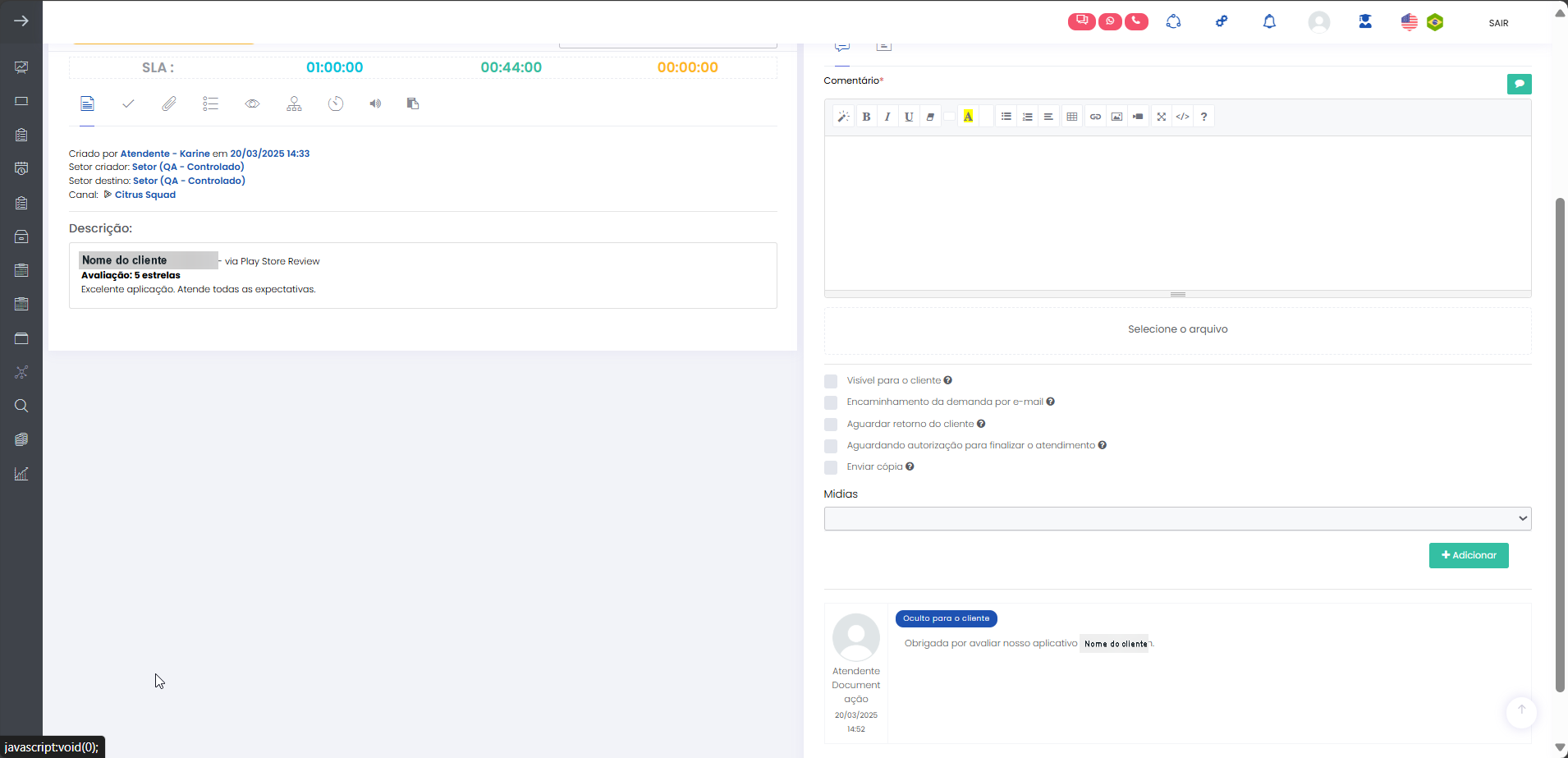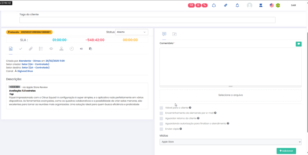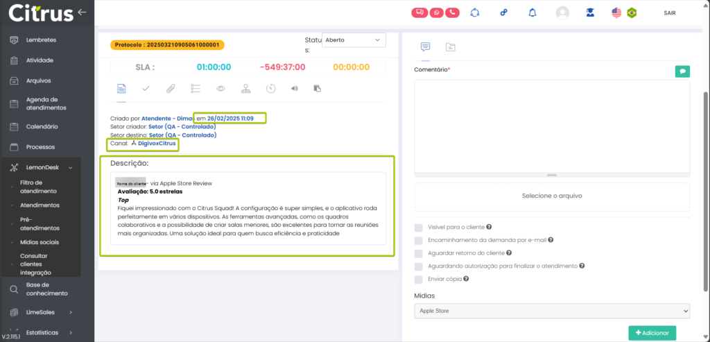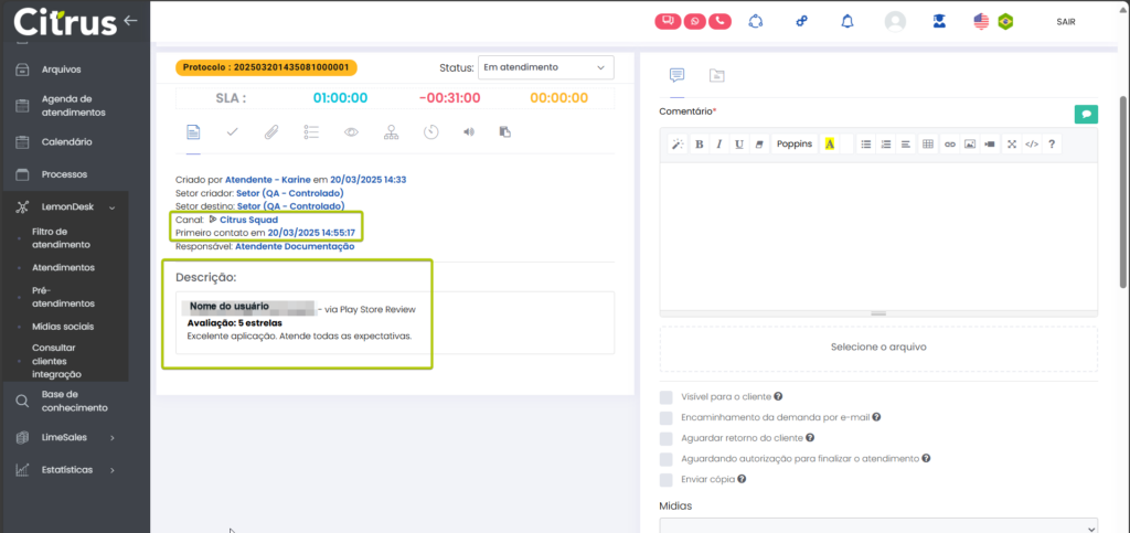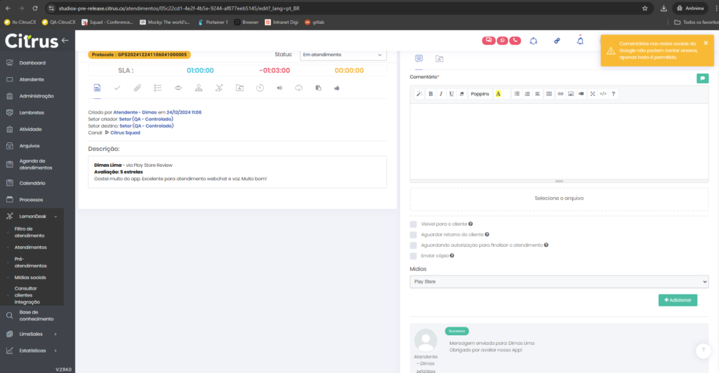 Versão 2.114.0 Estimated reading: 6 minutes 112 views 06/01/2025 Esta versão traz implementações para utilização dos canais Google Play Store e Apple Store como canal do atendimento omnichannel da solução Citrus, além de melhoria para bloquear respostas de Atendentes com anexos em atendimentos por canais do Google. NOVIDADES Administração: Google Play Store já pode ser configurado como canal de atendimento A tela de configuração para a integração do canal de atendimento Google Play Store já está disponível para que Administradores definam dados para a abertura automática de atendimentos originados da loja de aplicativos.A etapa de Configurações Gerais do canal deve ser realizada com apoio da equipe de Implantação Citrus, pelo menu Administração > Configurações Gerais > Google Play Store.A partir dela, a integração do canal poderá ser feita pelo menu Administração > Atendimentos > Integração canal de atendimento > +Novo.A tela de cadastro permite configurar o “Setor” e o “Nome do Aplicativo” na Play Store e a conversão automática de pré-atendimento para atendimento.As configurações salvas serão aplicadas automaticamente às novas mensagens recebidas na loja de aplicativos. Siga os passos para integrar interações de usuários do Google Play Store como atendimentos do canal no Citrus. Atendimentos: Implementada integração para envio de comentários de Atendimentos no Citrus ao Google Play Store Está implementado o envio automático das tratativas de atendimentos realizadas no Citrus para o Google Play Store, garantindo que as respostas de Atendentes sejam publicadas diretamente no chat da conversa com o cliente na loja de aplicativos.O fluxo de replicação de comentários feitos em atendimentos no Citrus no Google Play Store respeitará os seguintes critérios: Quando não existir nenhum comentário anterior de um Atendente (via Citrus), o primeiro comentário feito por um Atendente será registrado no Play Store como resposta ao comentário do cliente (da empresa que tem o aplicativo na loja). Se já existia um comentário de um Atendente (via Citrus) publicado na Play Store para responder o cliente e, um novo comentário de Atendente for registrado enquanto o atendimento no Citrus ainda não foi finalizado, o comentário mais recente substituirá o anterior na Play Store. O fluxo assegura que a comunicação com o cliente permaneça atualizada e consistente. Clique na imagem para ver em tela cheia. Atendimentos: Atendente pode conferir todos os dados de postagem de cliente no Google Play Store pelo atendimento no Citrus Ao abrir um atendimento do canal Google Play Store, o Atendente pode identificar: Nome do usuário que fez comentário na loja de aplicativos. A avaliação feita pelo usuário (número de curtidas/estrelas que utilizou para classificar o app). Texto do comentário do usuário. Data e horário do primeiro contato do usuário. Clique na imagem para ver em tela cheia. Administração: Implementada tela para configuração da Apple Store como canal de atendimento A tela de configuração para a integração do canal de atendimento Apple Store já está disponível para que Administradores definam dados para a abertura automática de atendimentos originados da loja de aplicativos.O canal deve ser configurado pelo menu Administração > Atendimentos > Integração canal de atendimento > +Novo.A tela de cadastro permite configurar o “Setor” e o “Nome do Aplicativo” na Apple Store e a conversão automática de pré-atendimento para atendimento.As configurações salvas serão aplicadas automaticamente às novas mensagens recebidas na loja de aplicativos. Clique na imagem para ver em tela cheia. A Configurações de conversão automática de pré-atendimento para atendimento aparecerá automaticamente habilitada no cadastro do canal. Atendimentos: Está disponível a integração para envio de comentários de Atendimentos no Citrus à Apple Store Está implementado o envio automático das tratativas de atendimentos realizadas no Citrus para a Apple Store, para que as respostas de Atendentes sejam publicadas diretamente no chat da conversa com o cliente na loja de aplicativos.O fluxo de replicação de comentários feitos em atendimentos no Citrus na Apple Store respeitará os seguintes critérios: Quando não existir nenhum comentário anterior de um Atendente (via Citrus), o primeiro comentário feito por um Atendente será registrado no Apple Store como resposta ao comentário do cliente (da empresa que tem o aplicativo na loja).Se já existia um comentário de um Atendente (via Citrus) publicado na Apple Store para responder o cliente e, um novo comentário de Atendente for registrado enquanto o atendimento no Citrus ainda não foi finalizado, o comentário mais recente substituirá o anterior na Apple Store. O fluxo assegura que a comunicação com o cliente permaneça atualizada e consistente. Clique na imagem para ver em tela cheia. Atendimentos: Atendente pode conferir todos os dados de postagem de cliente na Apple Store pelo atendimento no Citrus Ao abrir um atendimento do canal Apple Store, o Atendente pode identificar: Nome do usuário que fez comentário na loja de aplicativos. A avaliação feita pelo usuário (número de curtidas/estrelas que utilizou para classificar o app). Texto do comentário do usuário. Data e horário do contato do usuário. Clique na imagem para ver em tela cheia. MELHORIA Atendimentos: Criado alerta para notificar Atendente de que não é possível adicionar anexos em atendimentos de canais do Google Quando o Atendente tentar adicionar anexos ao responder um comentário de atendimento do canal Google Play Store ou Google Meu Negócio, visualizará um alerta informando que comentários em mídias sociais do Google não podem conter anexos. Clique na imagem para ver em tela cheia. A identificação de “Mídias”, indicando a plataforma que originou o atendimento, precisa estar ha